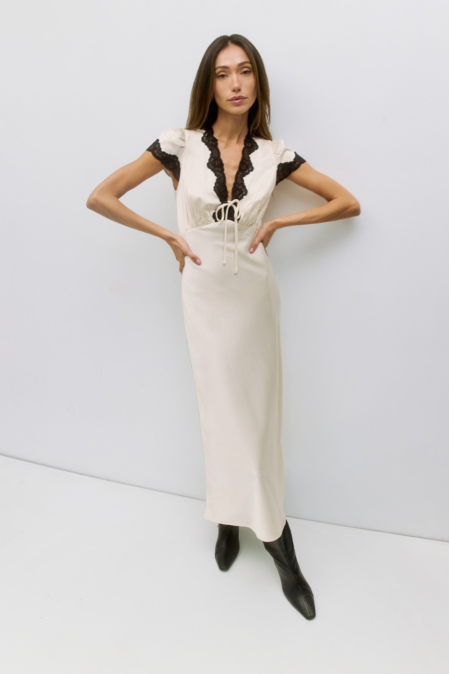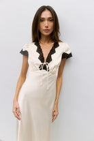 Crafted from luxurious bias-cut satin, this midi dress exemplifies refined elegance with thoughtful design details. The front V-neckline features a self-tie closure that allows for personalized styling, while delicate lace trim adorns the neckline and cap sleeve cuffs for added sophistication. A side invisible zipper ensures a seamless silhouette without compromising the dress's polished aesthetic. Perfect for occasions requiring understated luxury and impeccable tailoring.
