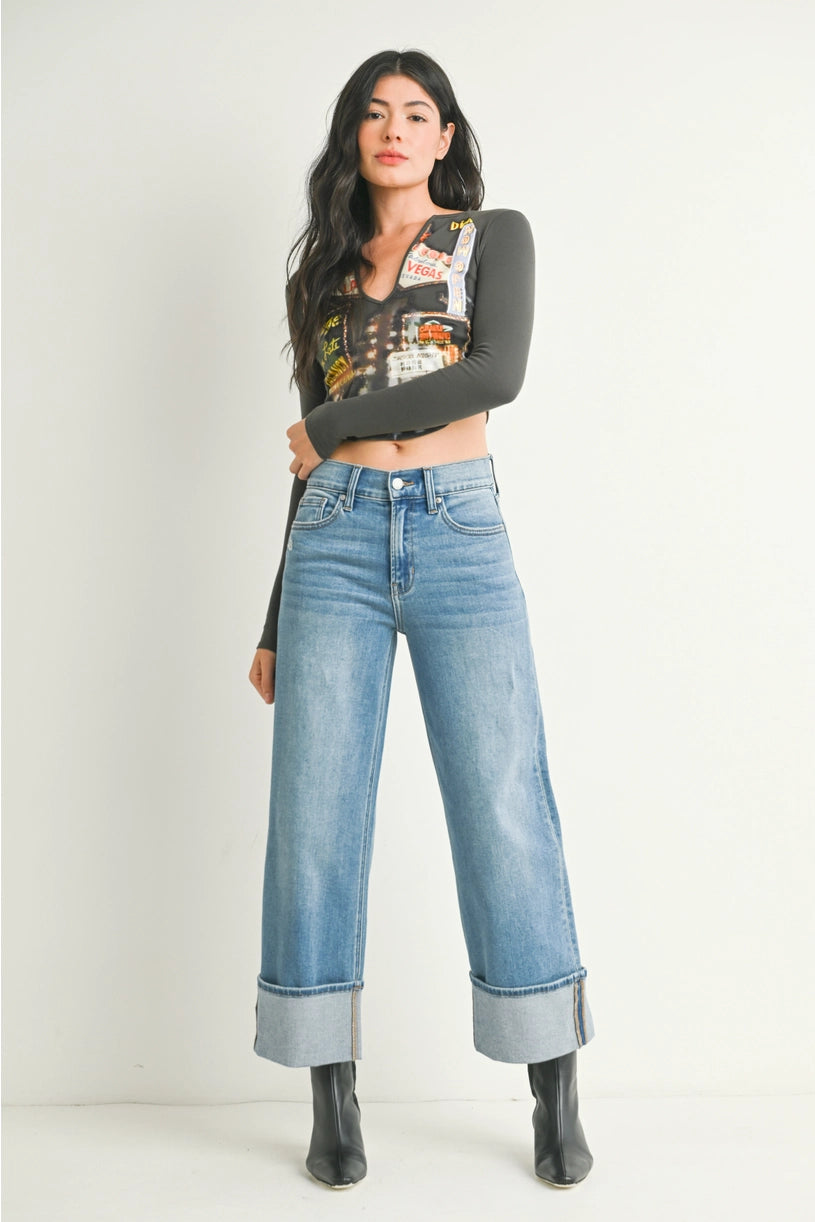 The Sasha Cuffed Denim features a 10.5" rise, 26.5" inseam, and a 10" leg opening, tailored in a medium denim wash. Designed with a petite cuffed slim wide fit, these jeans offer a modern silhouette that balances structure with comfort, ideal for those seeking a refined yet relaxed denim style.