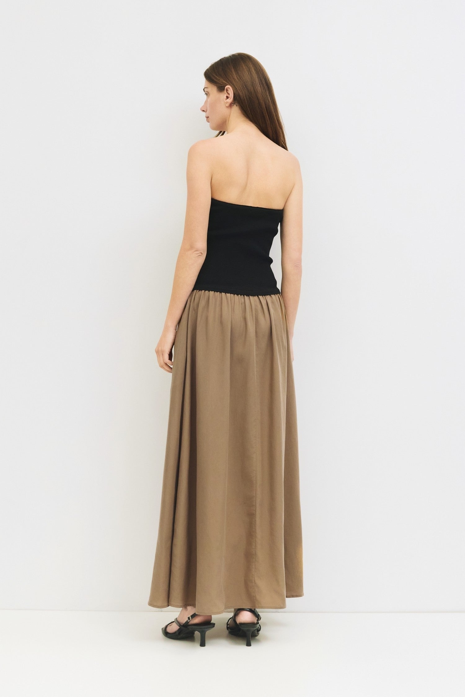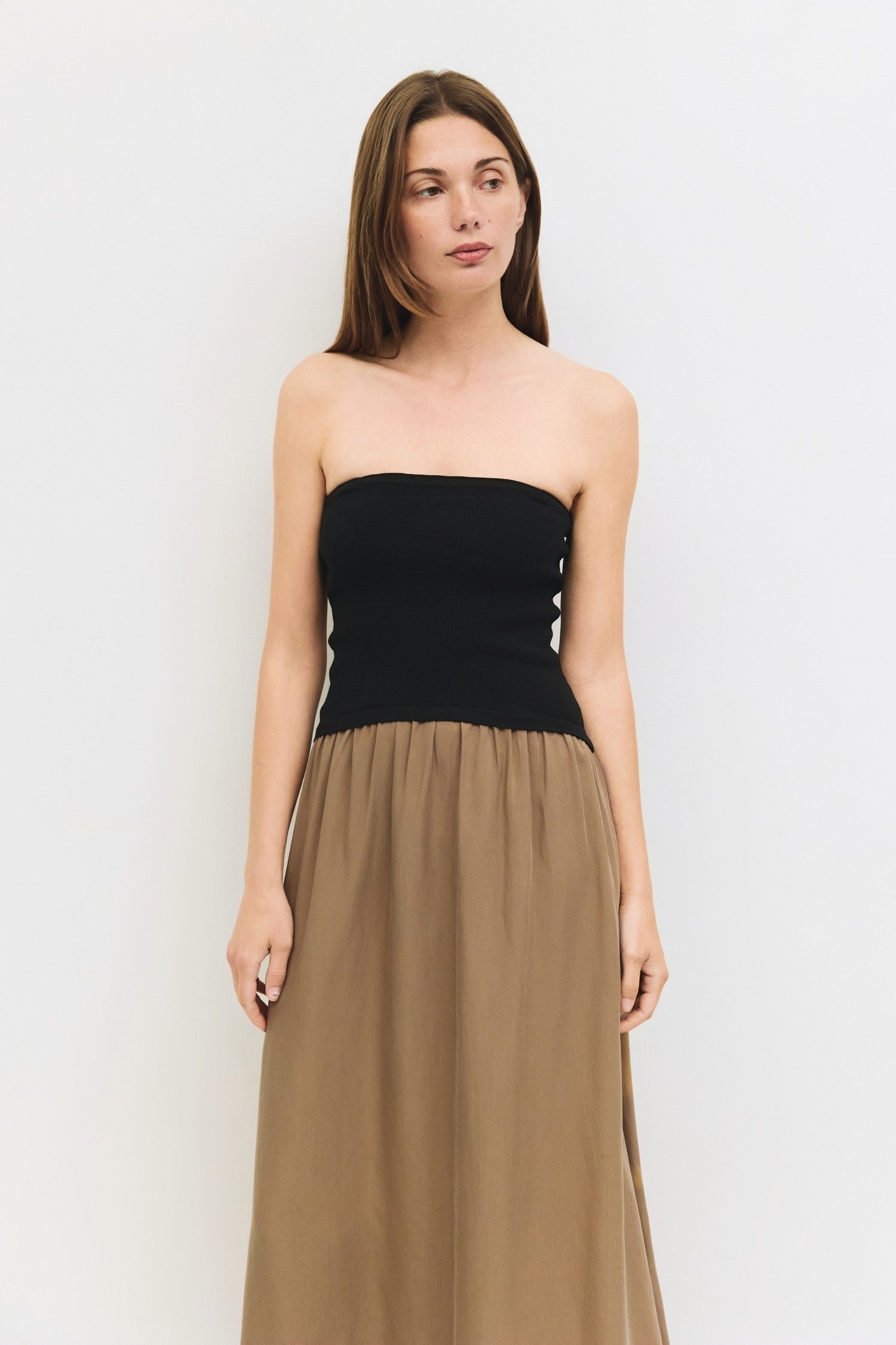 The Tesa Maxi combines a fitted, strapless knit bodice with a lightweight, shirred midi skirt to create a flattering two-tone silhouette. Designed with an expert eye for balance, the structured top provides support while the gathered skirt offers movement and comfort. Functional side pockets elevate the design, making this piece both stylish and practical for everyday wear or special occasions.