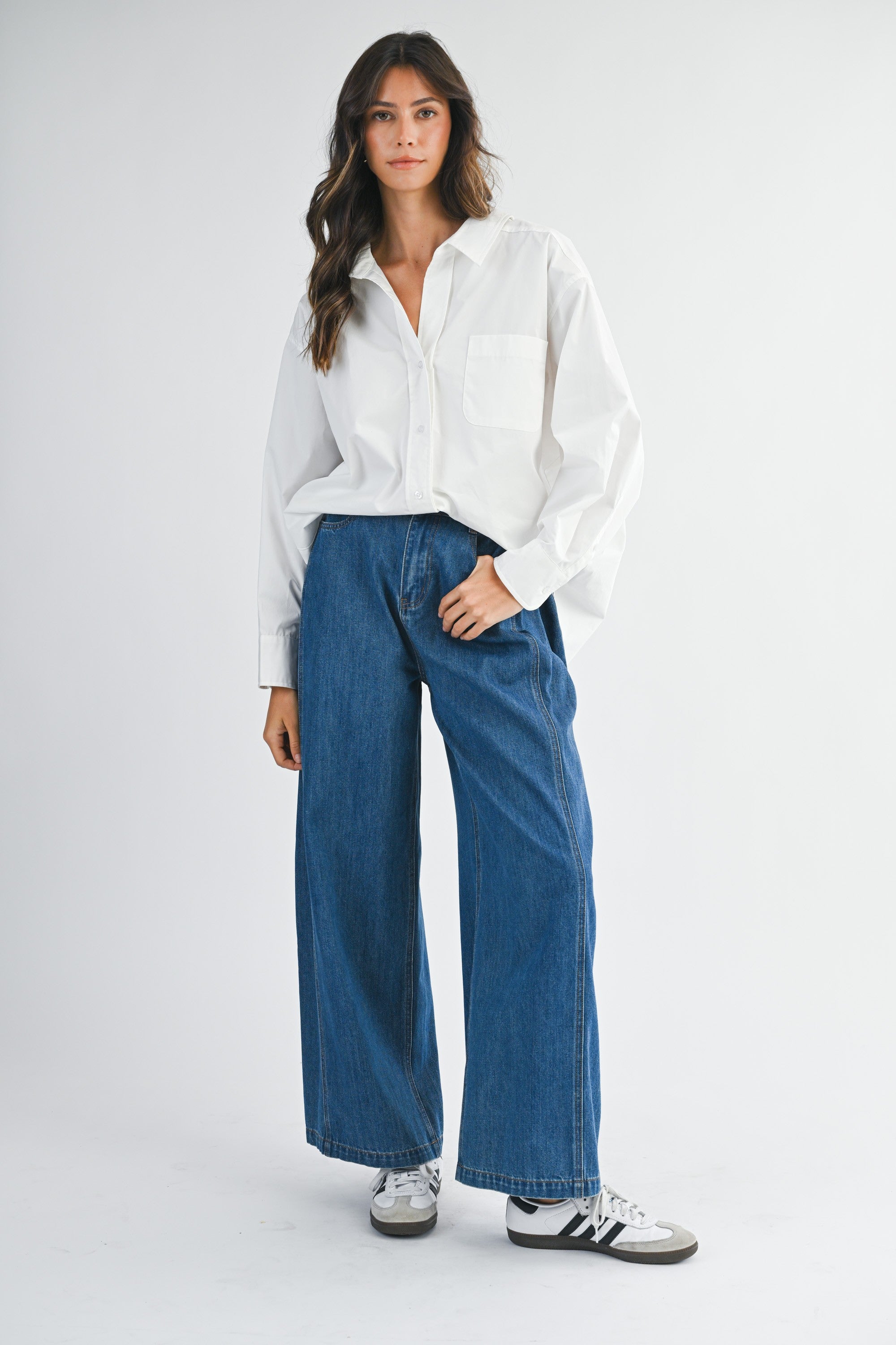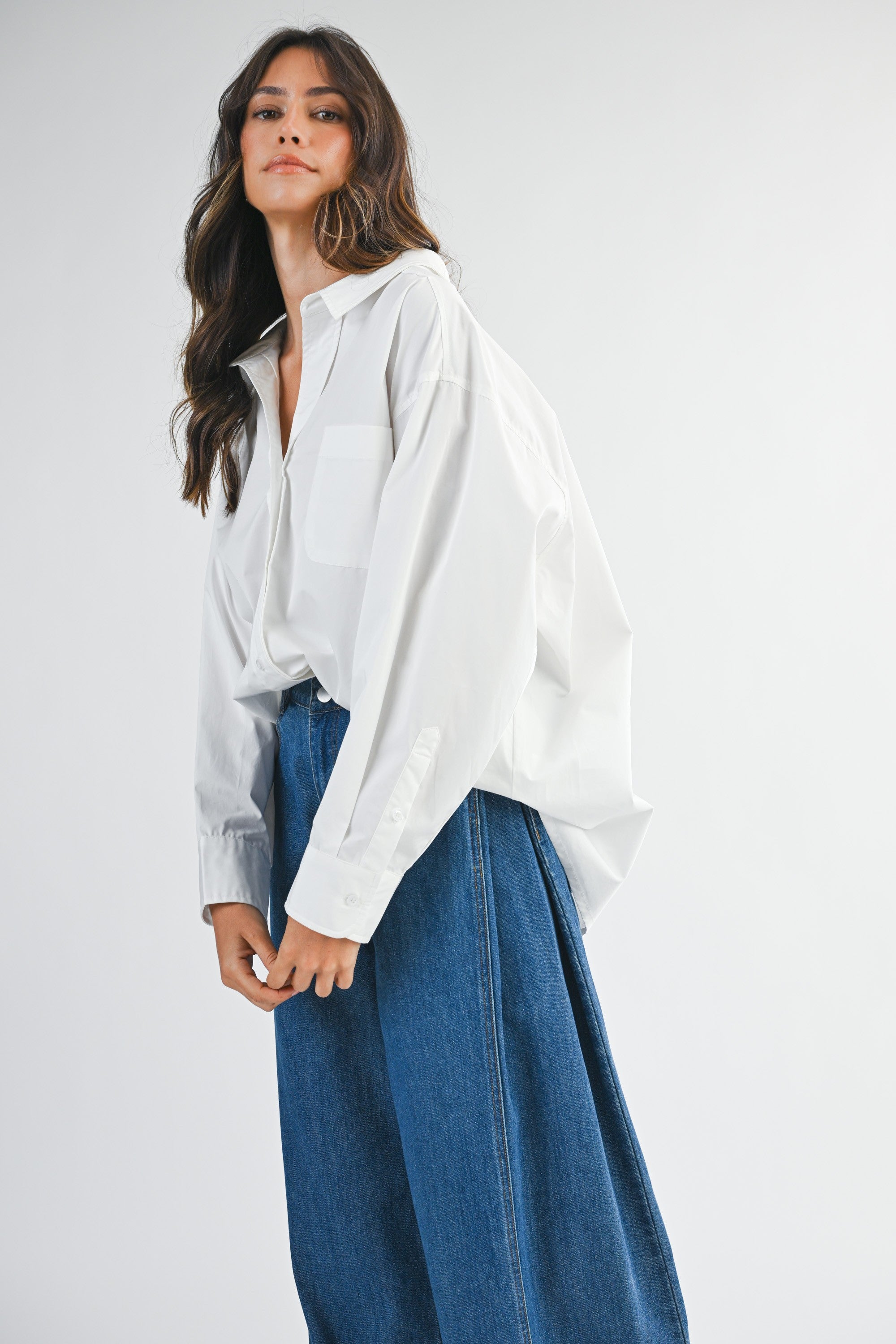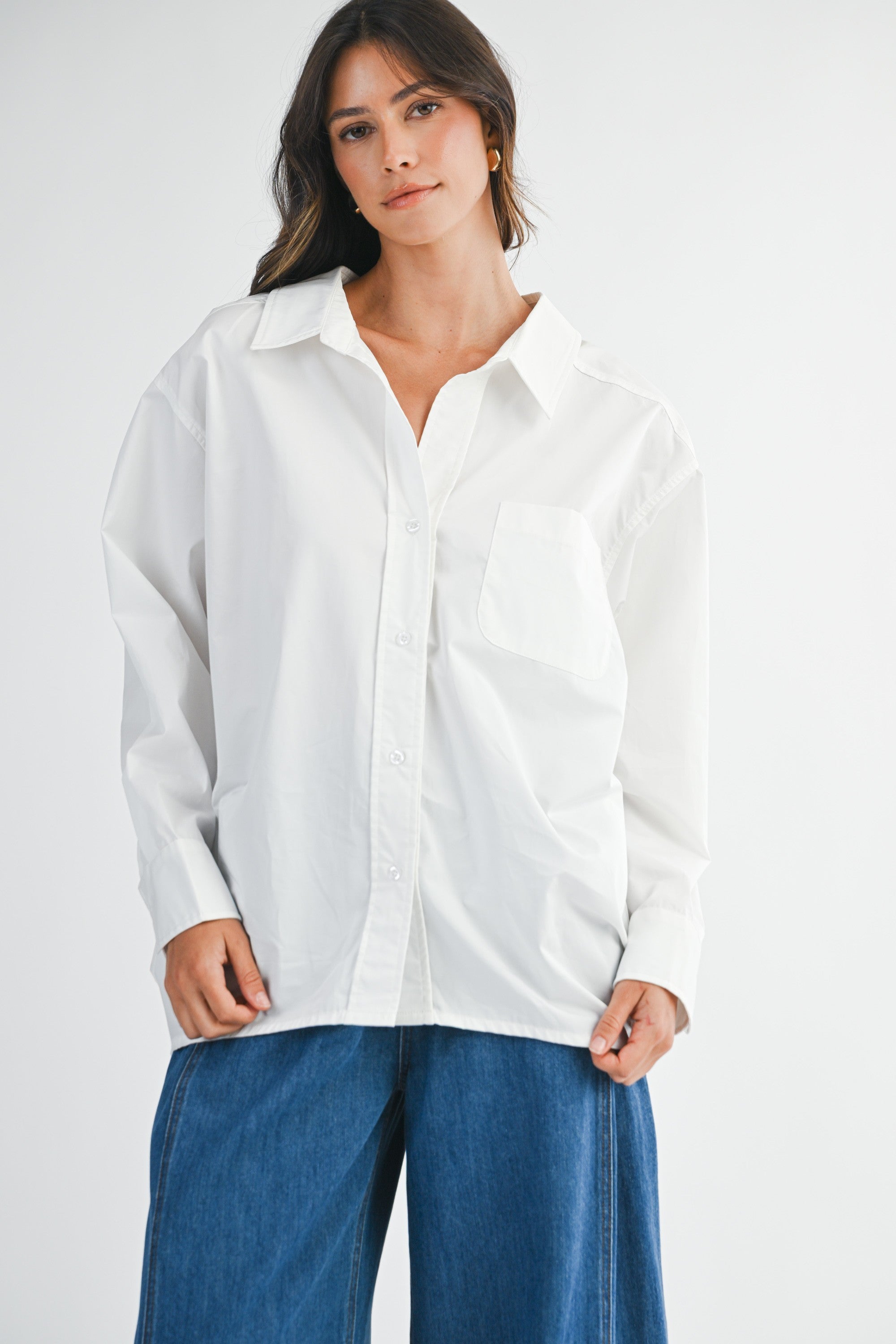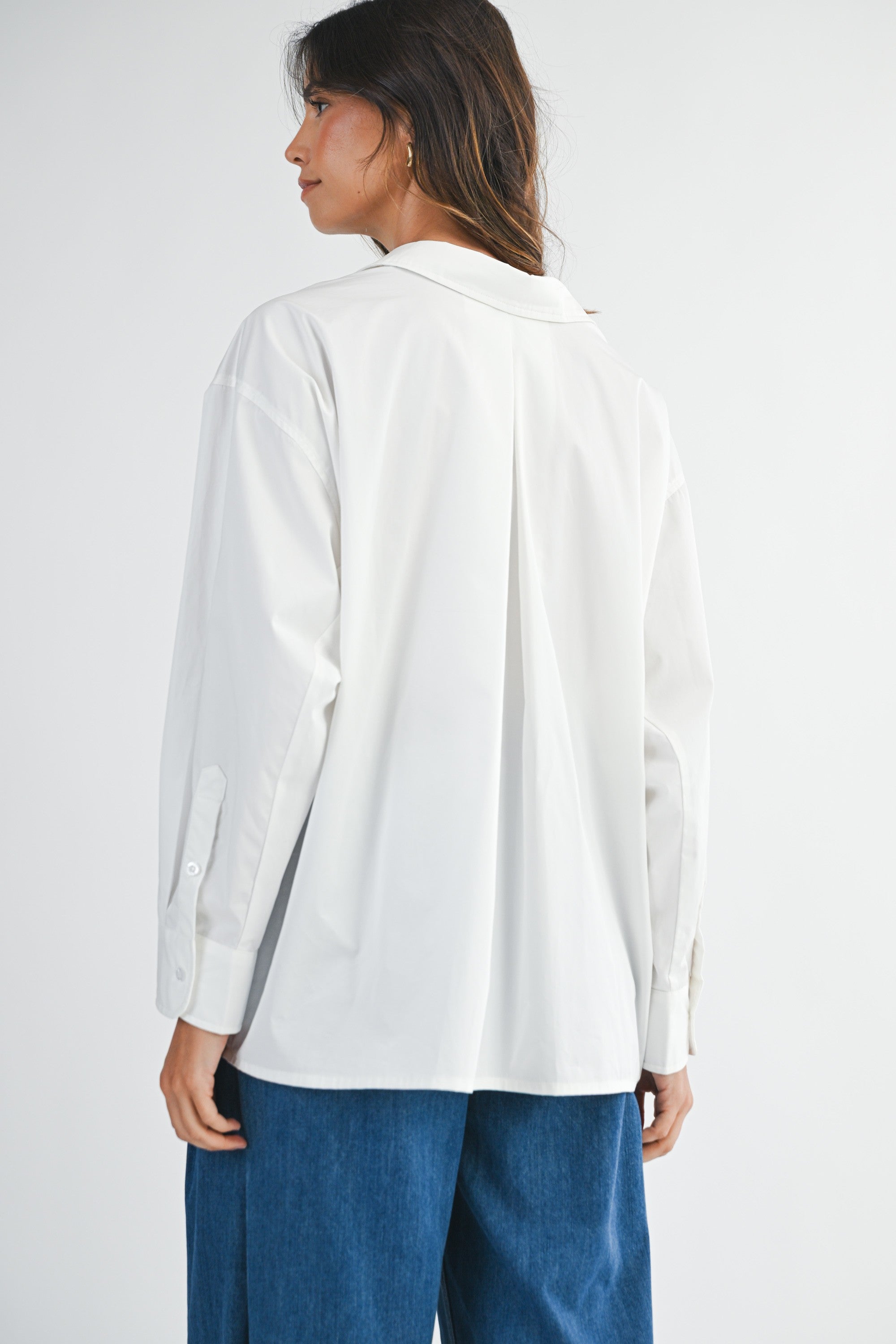 The Perfect Button Up is an essential oversized shirt designed for versatility and comfort. Crafted from 100% cotton, this full button-up features a pleated back detail that adds subtle elegance. Whether dressed up for a polished look or worn casually, it serves as a reliable staple in any wardrobe. Its breathable fabric and classic design ensure lasting wear and effortless style for any occasion.