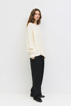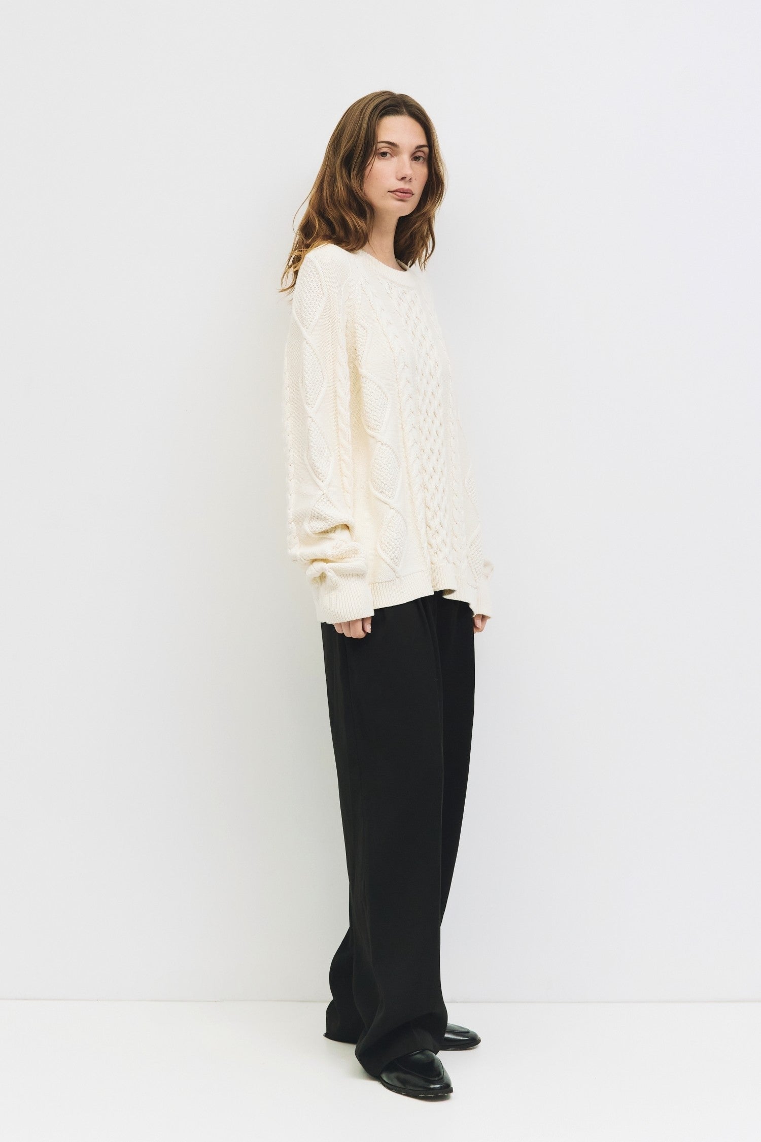 The Tilly Cable Knit features a classic crewneck and raglan long sleeves, crafted from midweight yarn that provides both warmth and rich texture. Its oversized fit delivers a relaxed, comfortable silhouette, making it an ideal layering piece for cooler days. Designed with expert attention to detail, this sweater combines timeless style with cozy functionality.