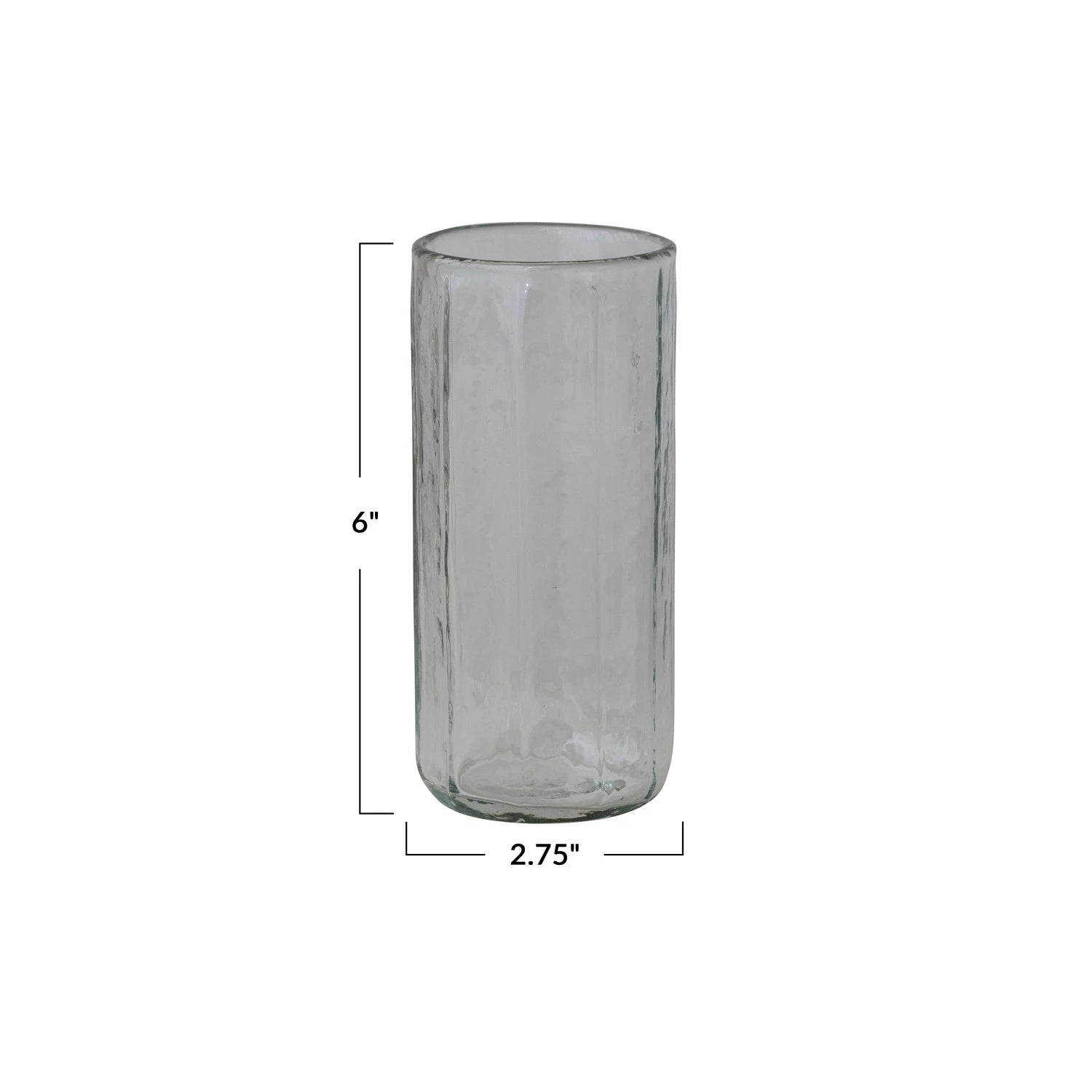 This hand-blown drinking glass measures 2-3/4 inches in diameter and 6 inches in height, with a 15-ounce capacity. Crafted with expert technique, its unique shape and clarity enhance the drinking experience while providing durability and elegance for everyday use.