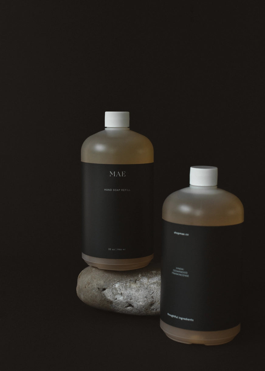 It refills your glass hand soap 8oz bottle four times or can be used in the shower as a body wash. Vegan and Palm-Free. Essential Oils (steam distilled) -