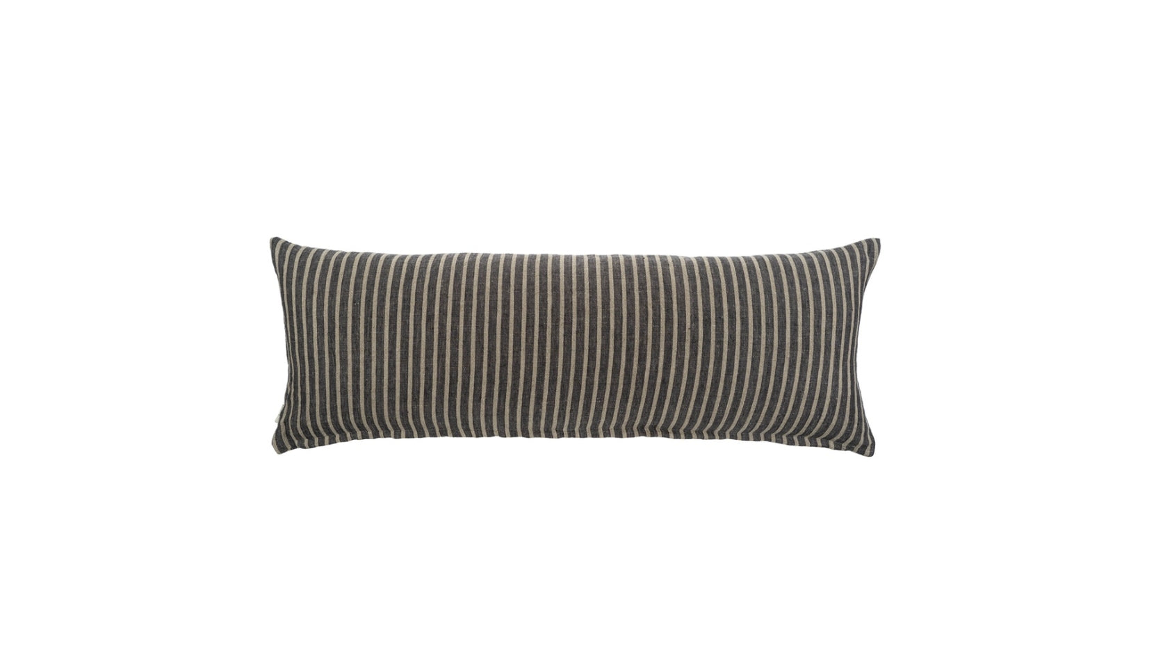 The Pinstripe Linen Pillow in 15"x42" offers a refined yet relaxed aesthetic with its vertical stripes in natural linen and charcoal grey. Made from soft, stonewashed Belgian linen, it delivers understated luxury and comfort. Filled with premium Responsible Down Standard (RDS) certified feather and down, this pillow provides plush support ideal for lounging or reading. Its generous size complements both queen and king beds, whether used alone or in combination. Easy to care for, it is machine washable on a gentle cycle, ensuring lasting quality and style.