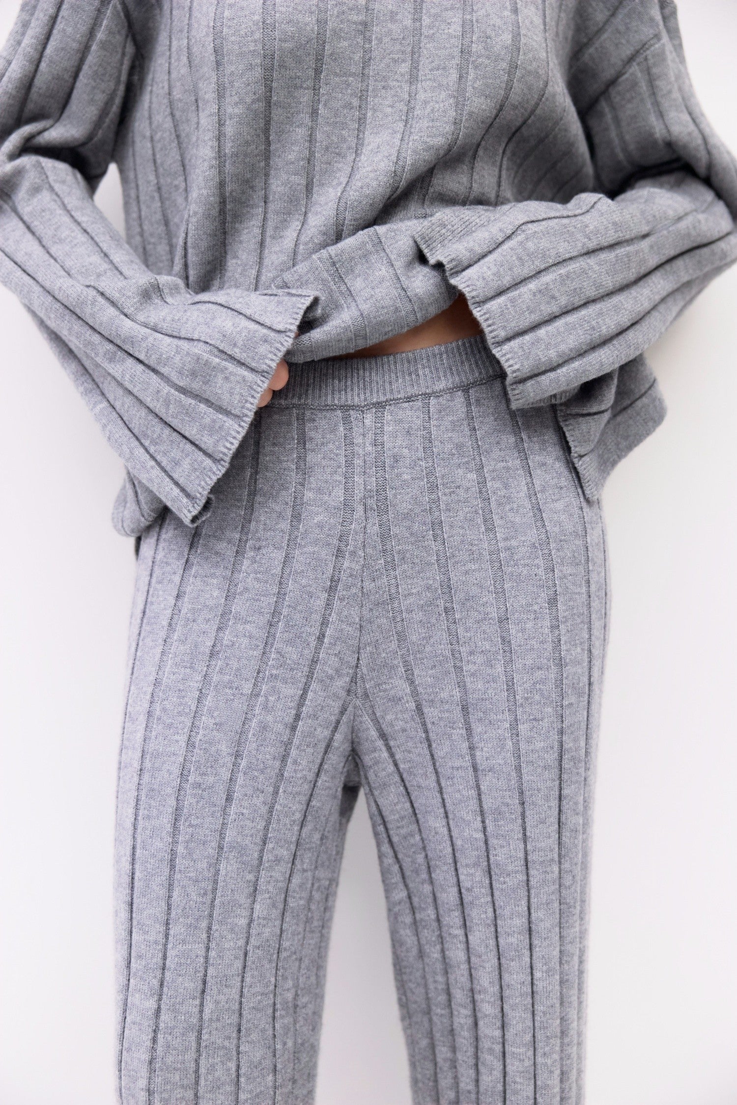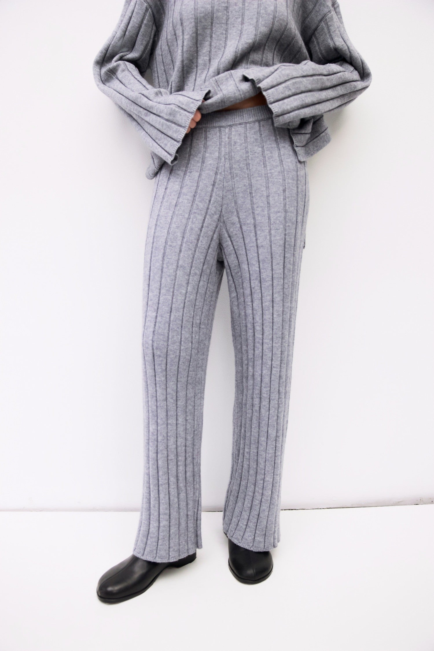Experience comfort and style with the Delilah Pants in grey. Crafted from a midweight, thick ribbed knit, these lounge pants offer warmth and durability. The elastic waistband ensures a secure yet flexible fit, while the relaxed, flared silhouette allows for effortless movement. Perfectly designed to be paired as a set, they provide a cohesive, polished look ideal for lounging or casual outings.