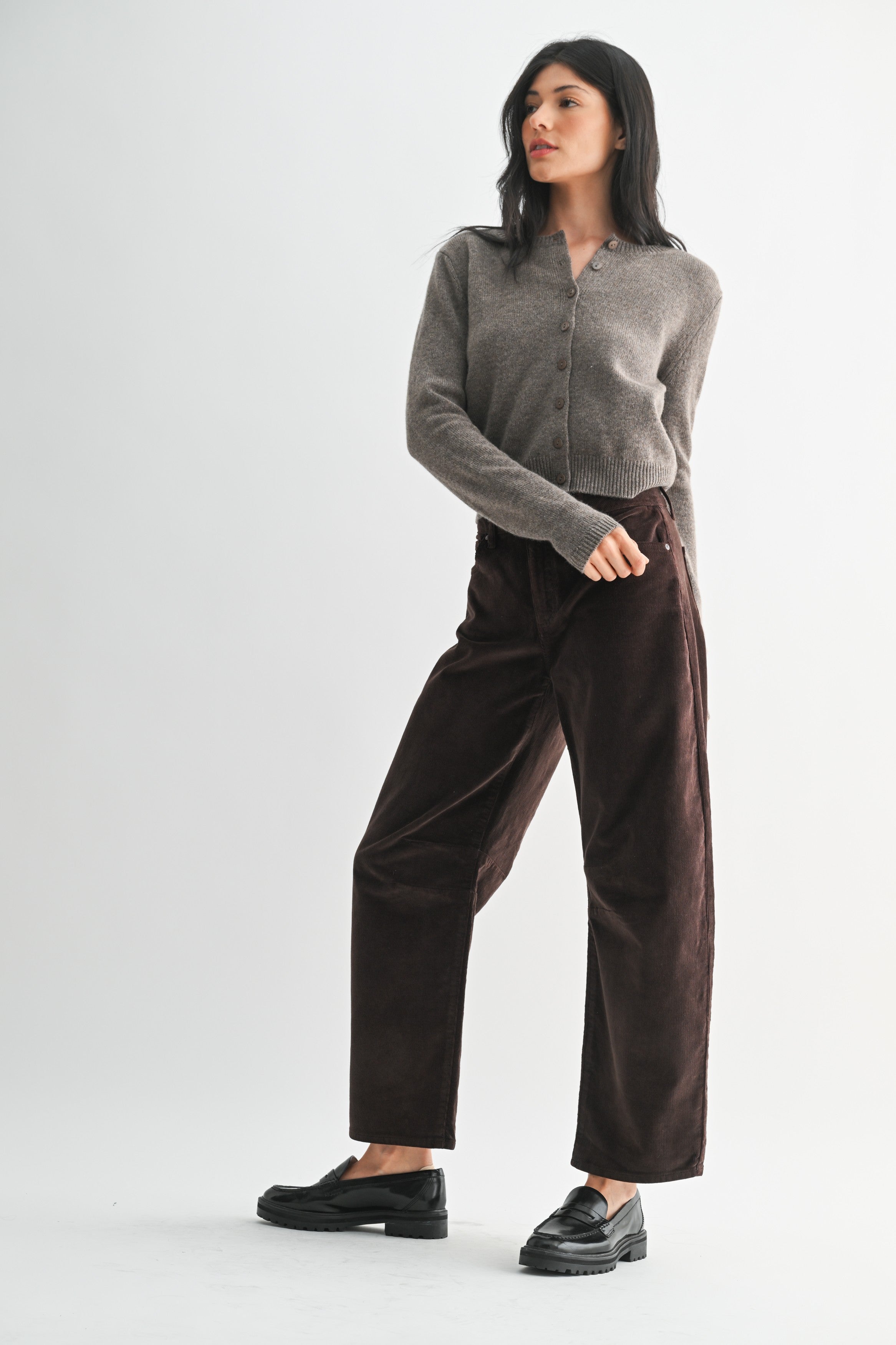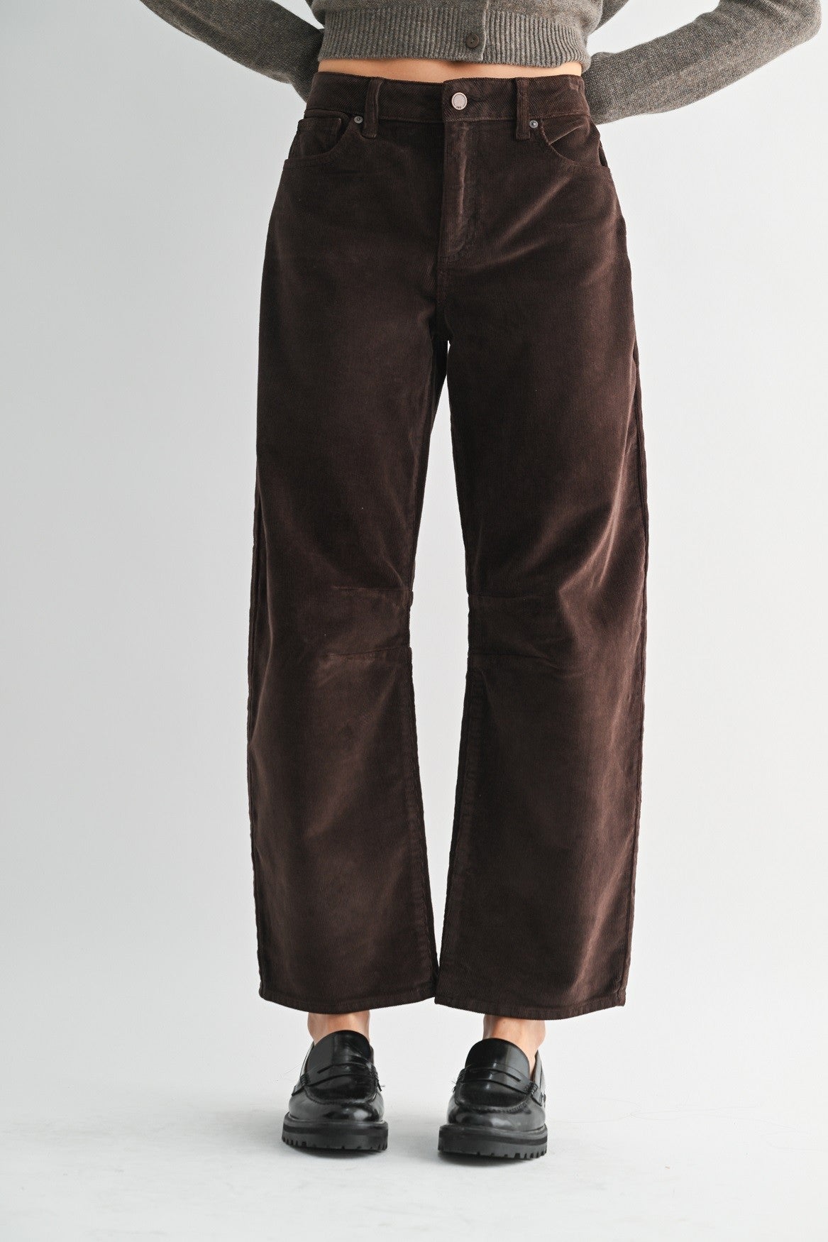These Mal Chocolate Cords combine a relaxed fit through the hips and thighs with a distinctive barrel leg silhouette, updating classic corduroy with a contemporary flair. The deep, earthy dark brown color offers versatile warmth, making these jeans an ideal choice for stylish, comfortable everyday wear.