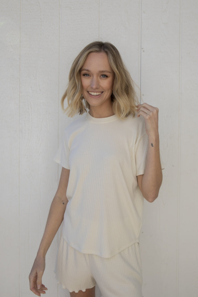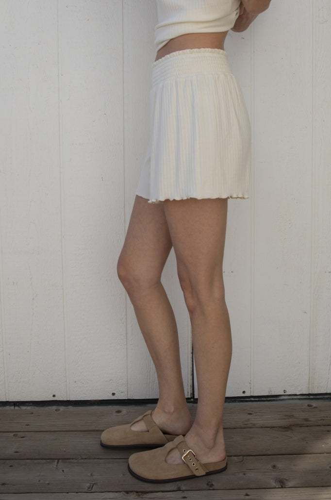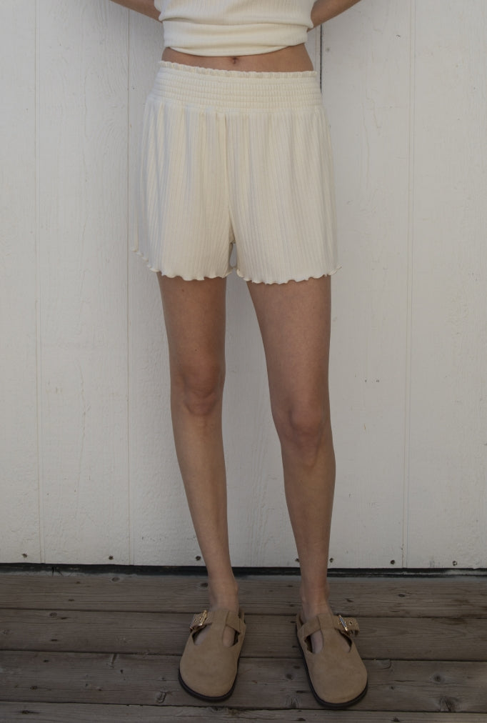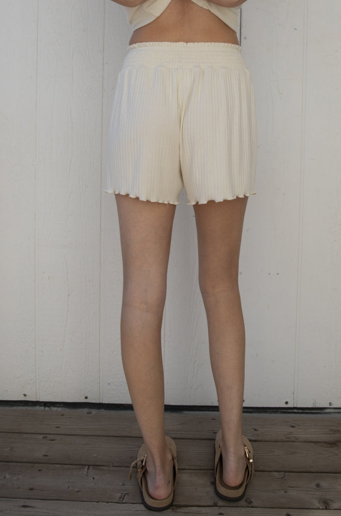 Experience ultimate comfort and style with Alani Cream Shorts. These ribbed shorts feature a ruffle hem for a delicate touch and an elastic waist for a perfect fit. Look and feel your best wherever you go with these versatile and chic shorts.