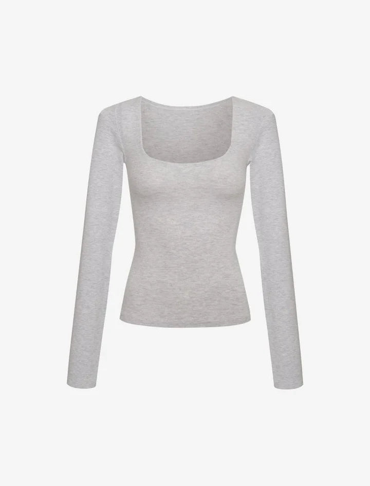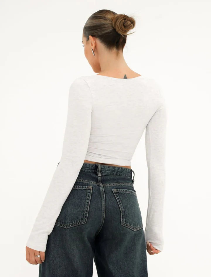 Introducing the Be Mine Long Sleeve from Rumored. Designed with a form-fitting scoop neck and crafted from butter soft fabric, this top is both comfortable and stylish. Perfect for any occasion, you'll love how it effortlessly flatters your figure. Upgrade your wardrobe with this must-have piece, available in Carrara.