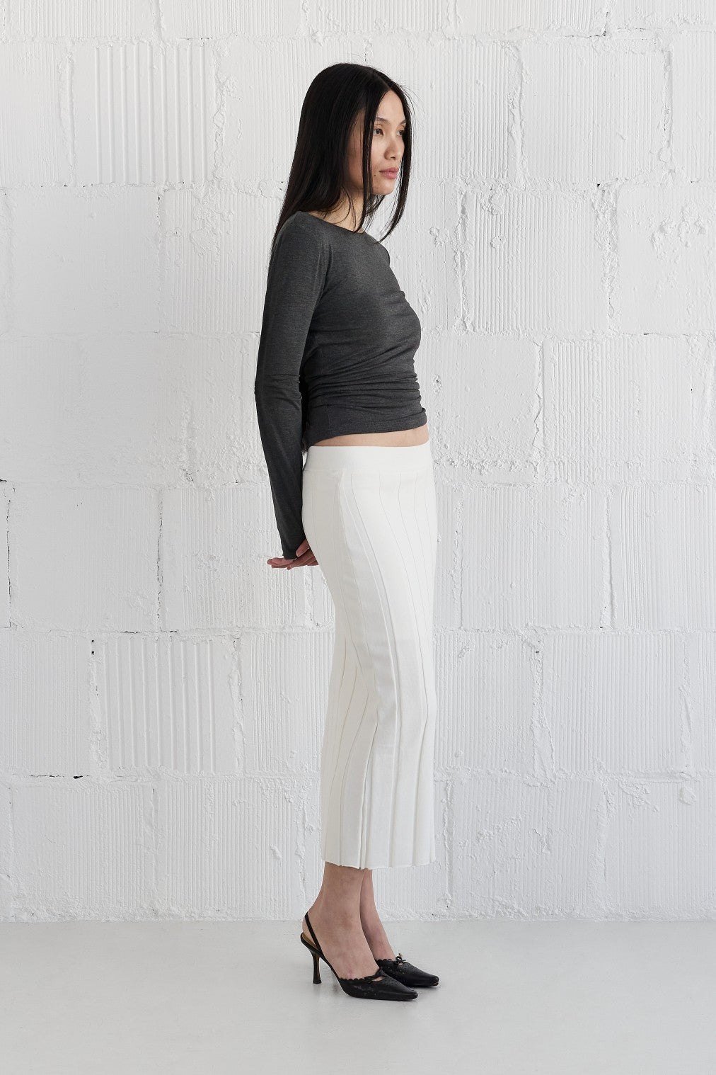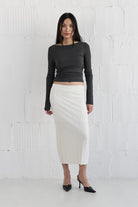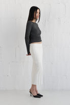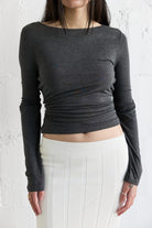 Expertly crafted with stretchy jersey fabric, the Grace Longsleeve in charcoal effortlessly hugs your form for a sleek silhouette. The double-layered bodice and boat neck design add timeless elegance to this essential piece.