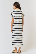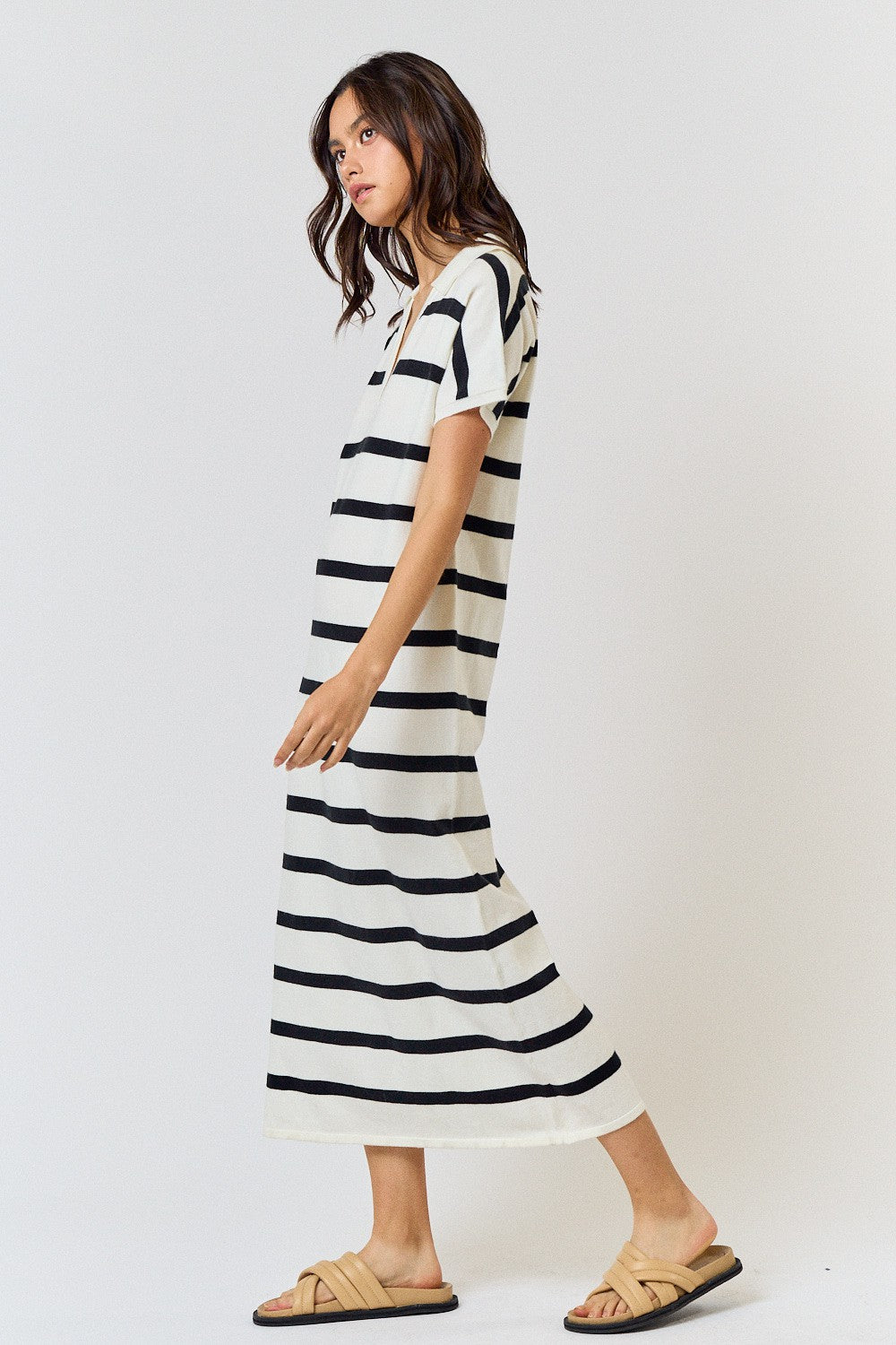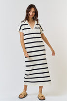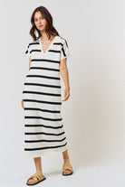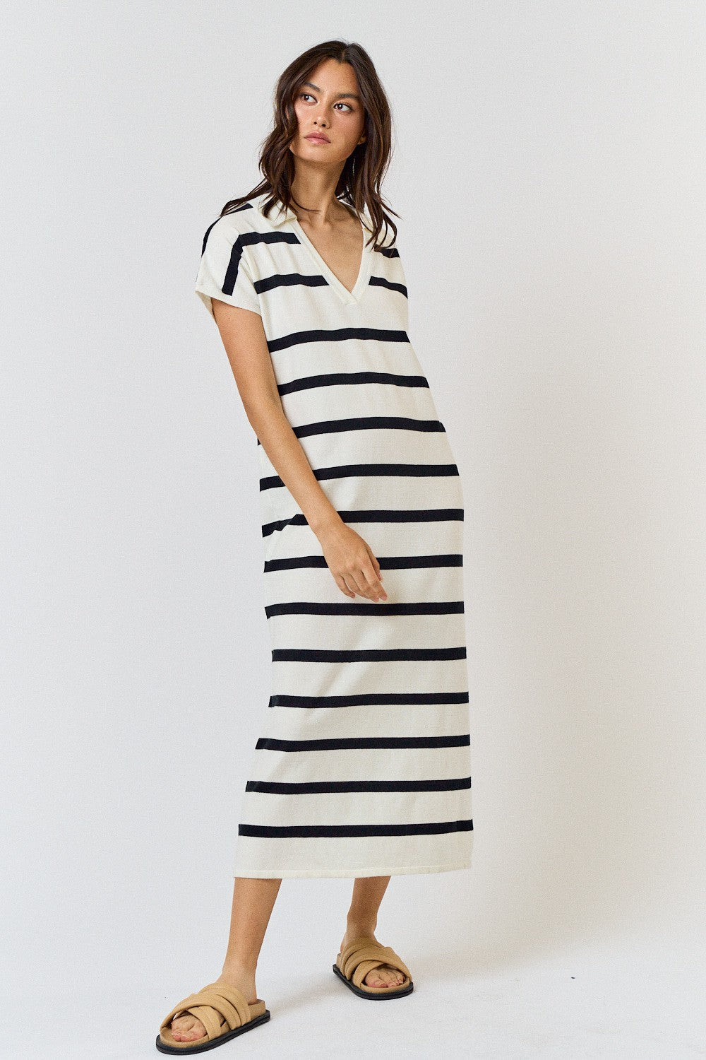 The Hazel Striped Midi is a sophisticated sweater dress with a collared v neck design. Its classic stripes add a touch of elegance, while the comfortable fabric makes it perfect for both work and play. Elevate your wardrobe with this versatile and stylish piece.