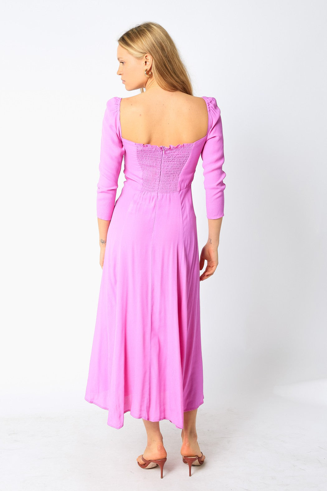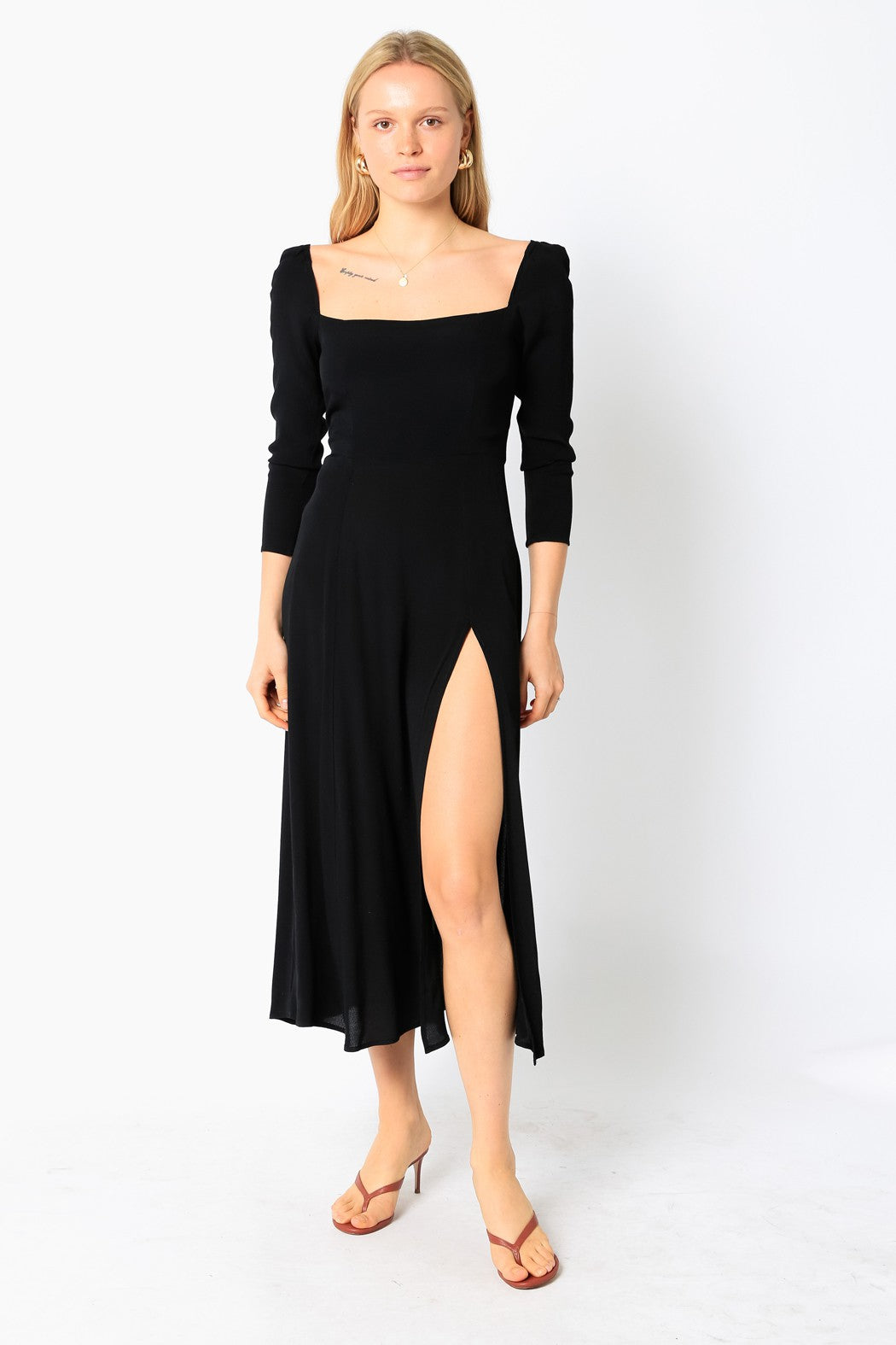 Experience elegance and sophistication with the Jenna Midi. Its sleek black design is accented with a front slit and ruched panel back, perfect for adding a touch of glamour to any occasion. Expertly crafted with impeccable attention to detail, this dress is a must-have for any fashion-forward individual.