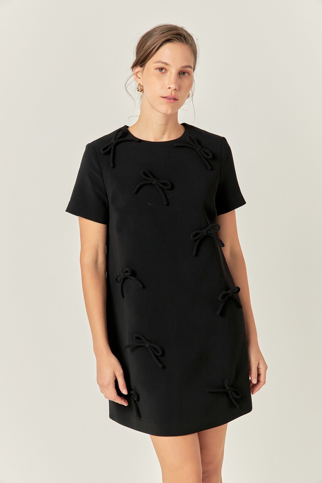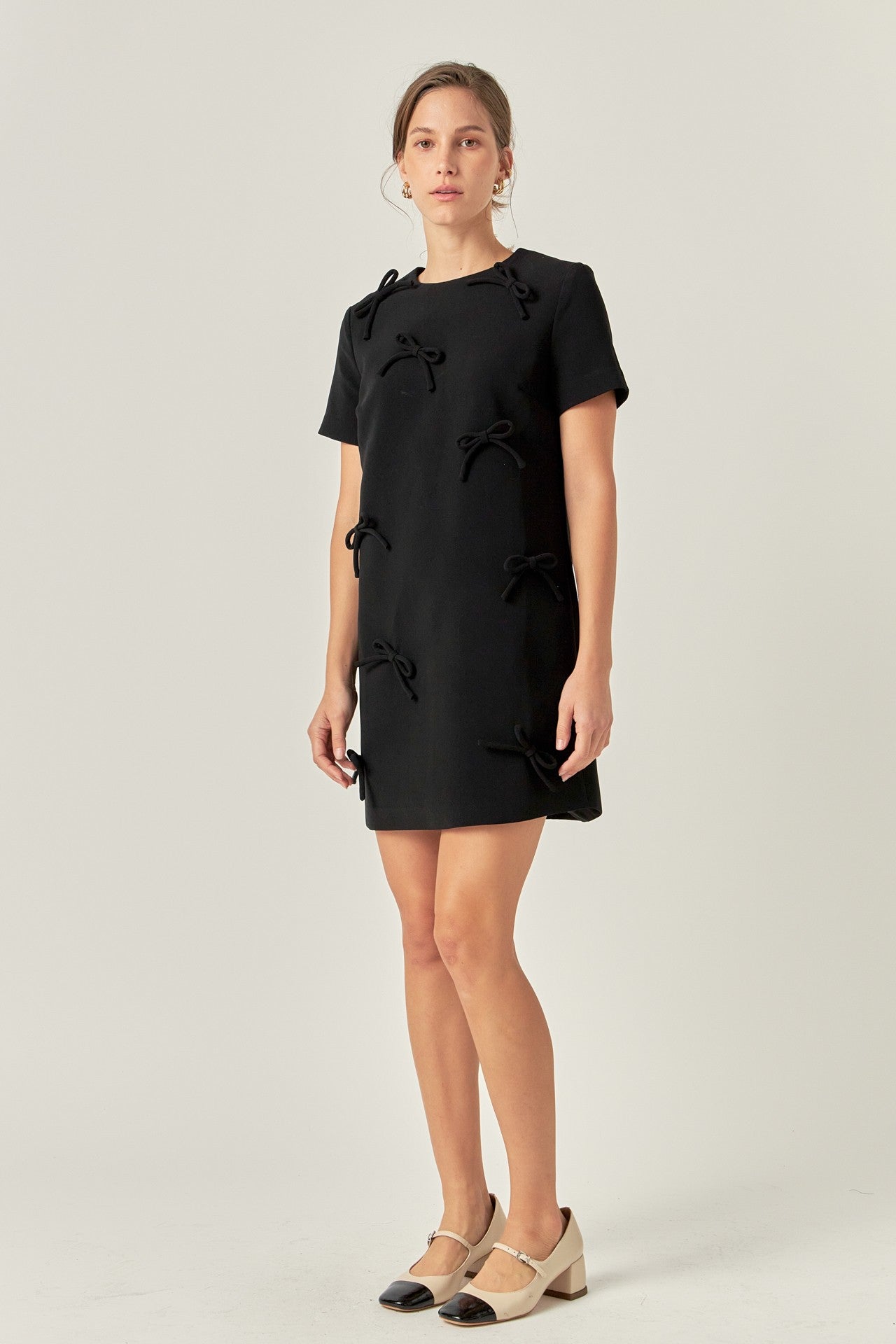 The Nicholas Bow Mini dress features a charming bow detail, adding a playful touch to its classic design. With a round neckline, short sleeves, and side chest dart, this dress offers a flattering fit. The back invisible zipper closure ensures a seamless finish, while its mini length allows you to be the life of your holiday party.