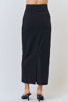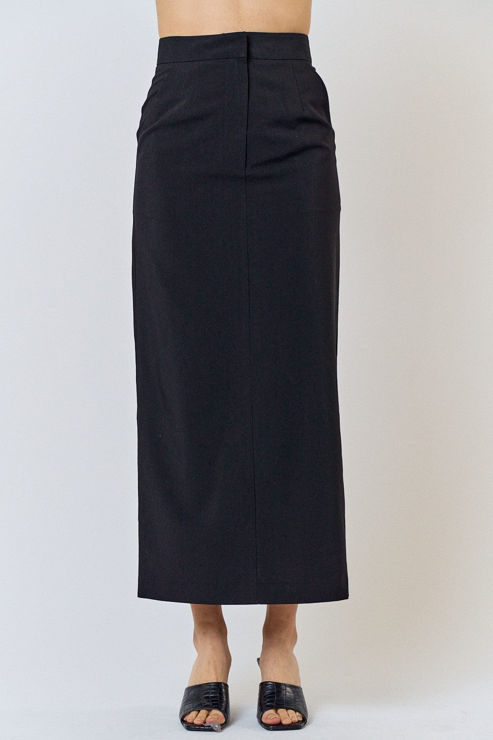 The Colm Maxi Skirt offers ultimate versatility, perfect for everyday wear or dressing up for any occasion. Designed with a stretch back and a sleek black color, this maxi skirt provides both comfort and style. With a trendy slit, it can easily be dressed up or down for any event. Perfect for layering or styling with your favorite fashion pieces.