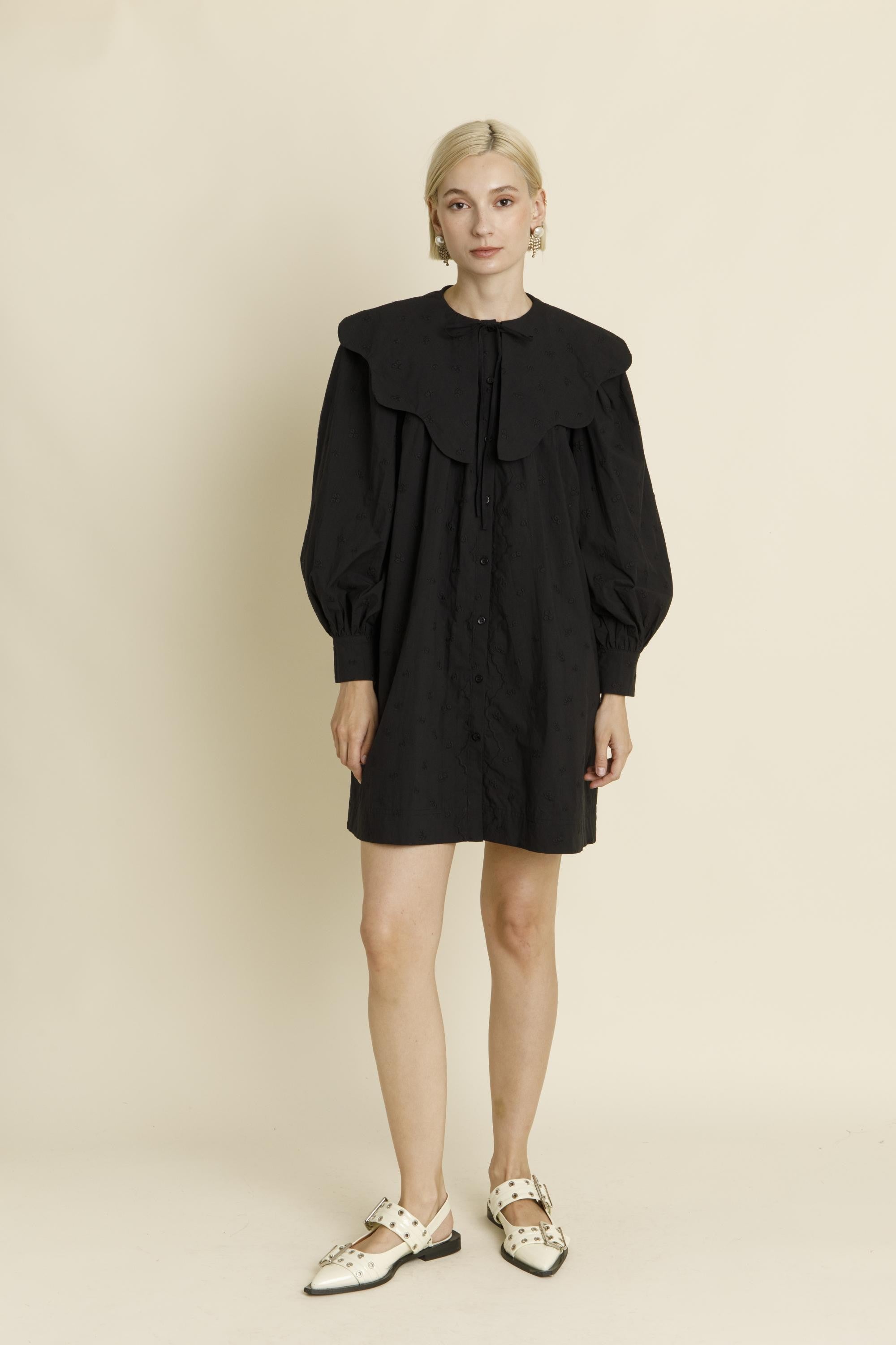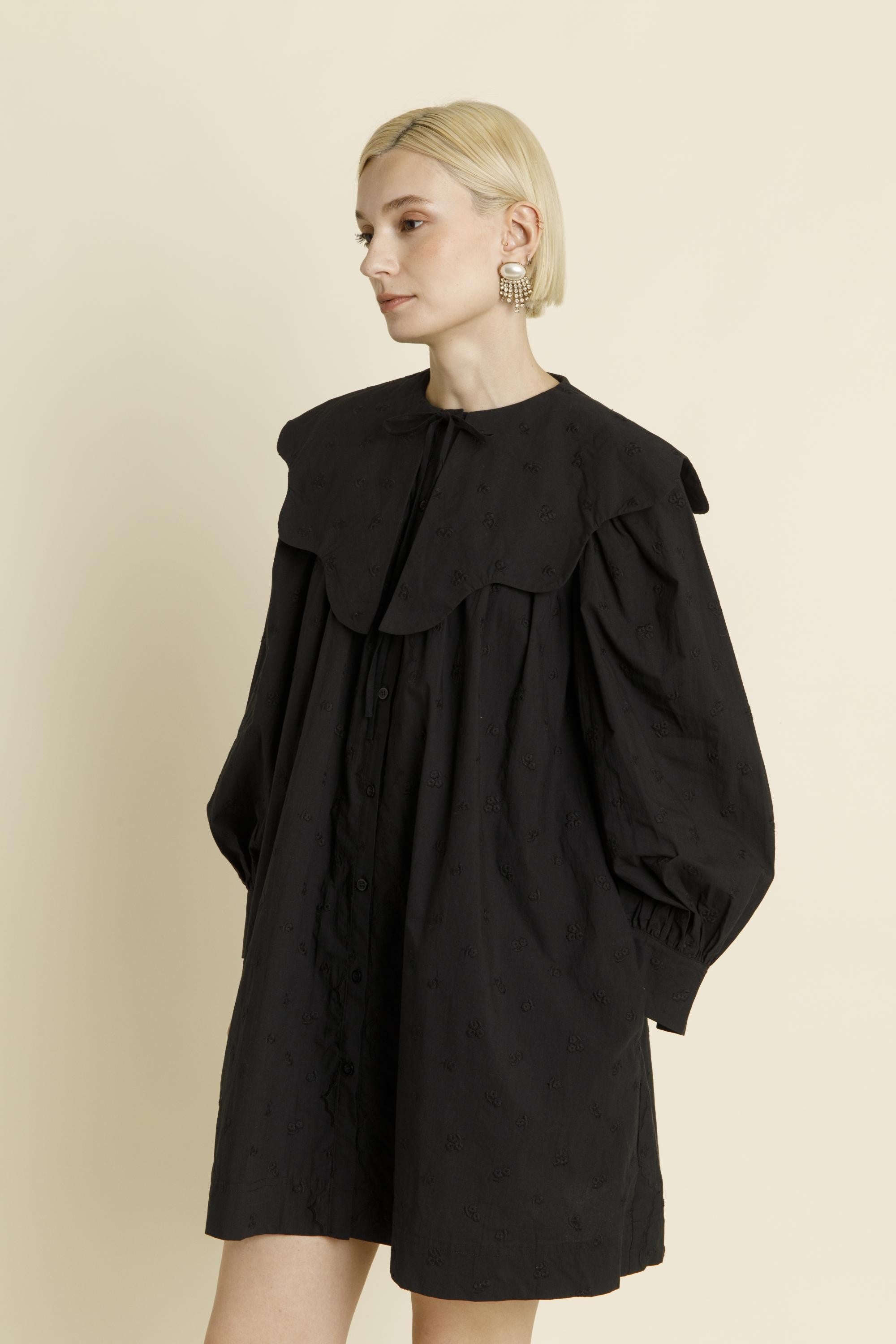 Crafted from high-quality cotton poplin with delicate embroidery, this top features an oversized scallop collar for a touch of elegance. The front button closure and self tie offer a customizable fit, while hidden side seam pockets add practicality. A timeless piece for any wardrobe.