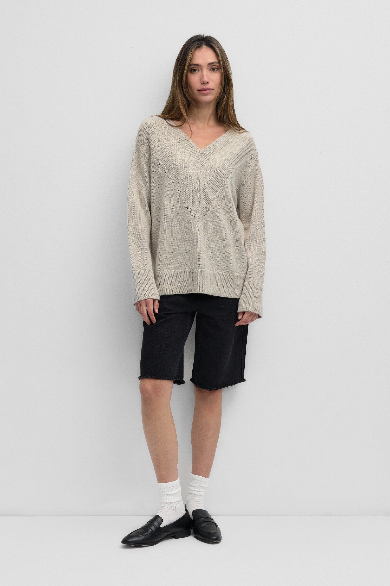Introducing the Veronica Pullover - the perfect blend of comfort and style. This oversized sweater boasts a ribbed v-neck for added texture and wide sleeves for ultimate comfort. Pair with your go-to denim for a relaxed look, or dress it up with a skirt for a polished ensemble. Versatile and oh-so-cozy.