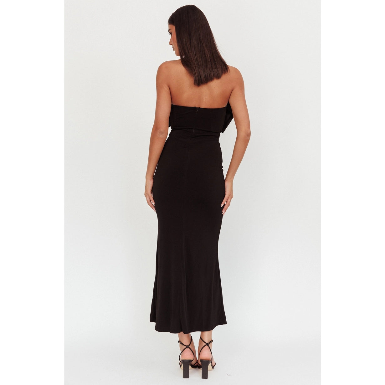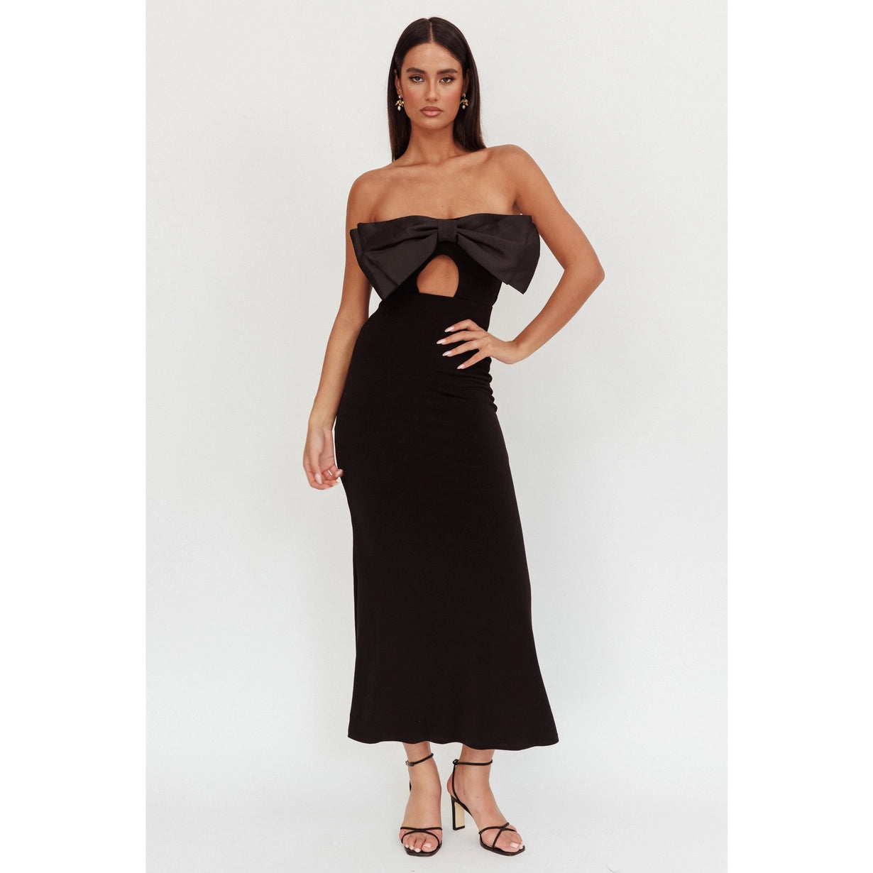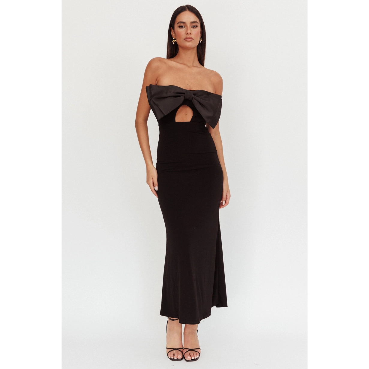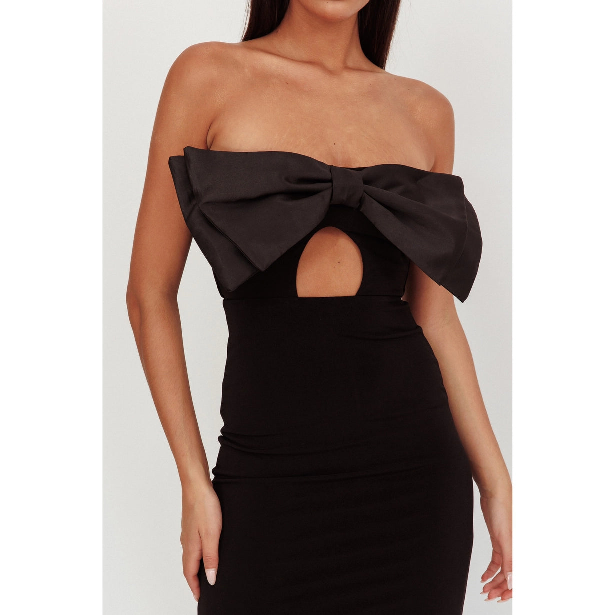The Clause Bow Maxi epitomizes sophisticated glamour with its distinctive design elements. A striking front bow tie adds architectural interest while a keyhole cutout provides subtle allure. The strapless silhouette elongates the neckline, creating an elegant canvas for statement jewelry or delicate accessories. Floor-length proportions deliver timeless appeal, while the back zipper ensures a seamless, polished finish. This maxi dress transitions beautifully from formal events to upscale celebrations, offering the perfect balance of modern detailing and classic elegance. An investment piece that commands attention through refined restraint.