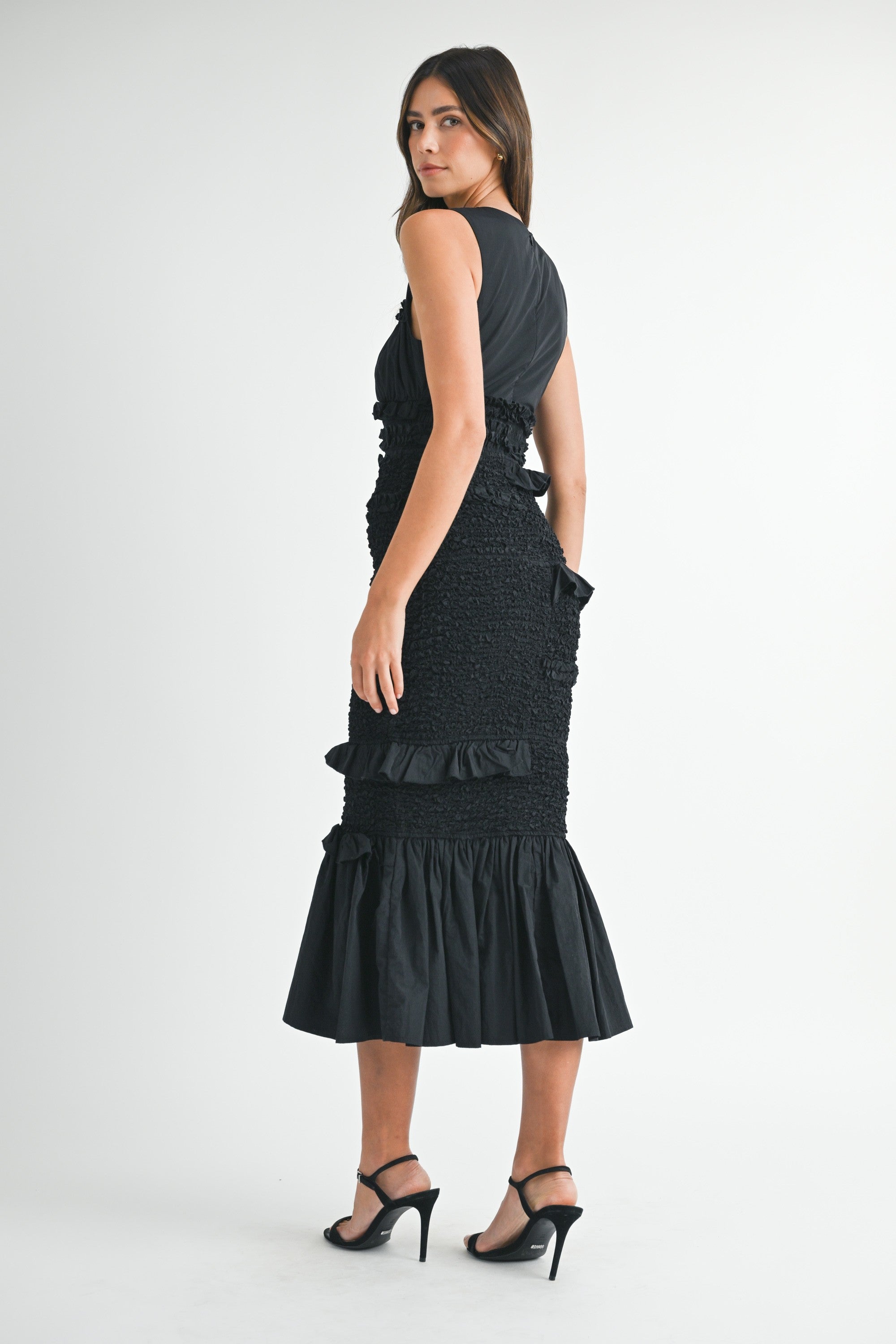 This sleeveless Kecle Mermaid Midi dress features a delicate popcorn smocked bodice that contours the figure, seamlessly transitioning into a mermaid silhouette with a subtle ruffle detail for added movement. Fully lined for comfort, the dress is crafted from 100% nylon with a polyester lining, ensuring a lightweight yet structured fit ideal for stylish occasions.