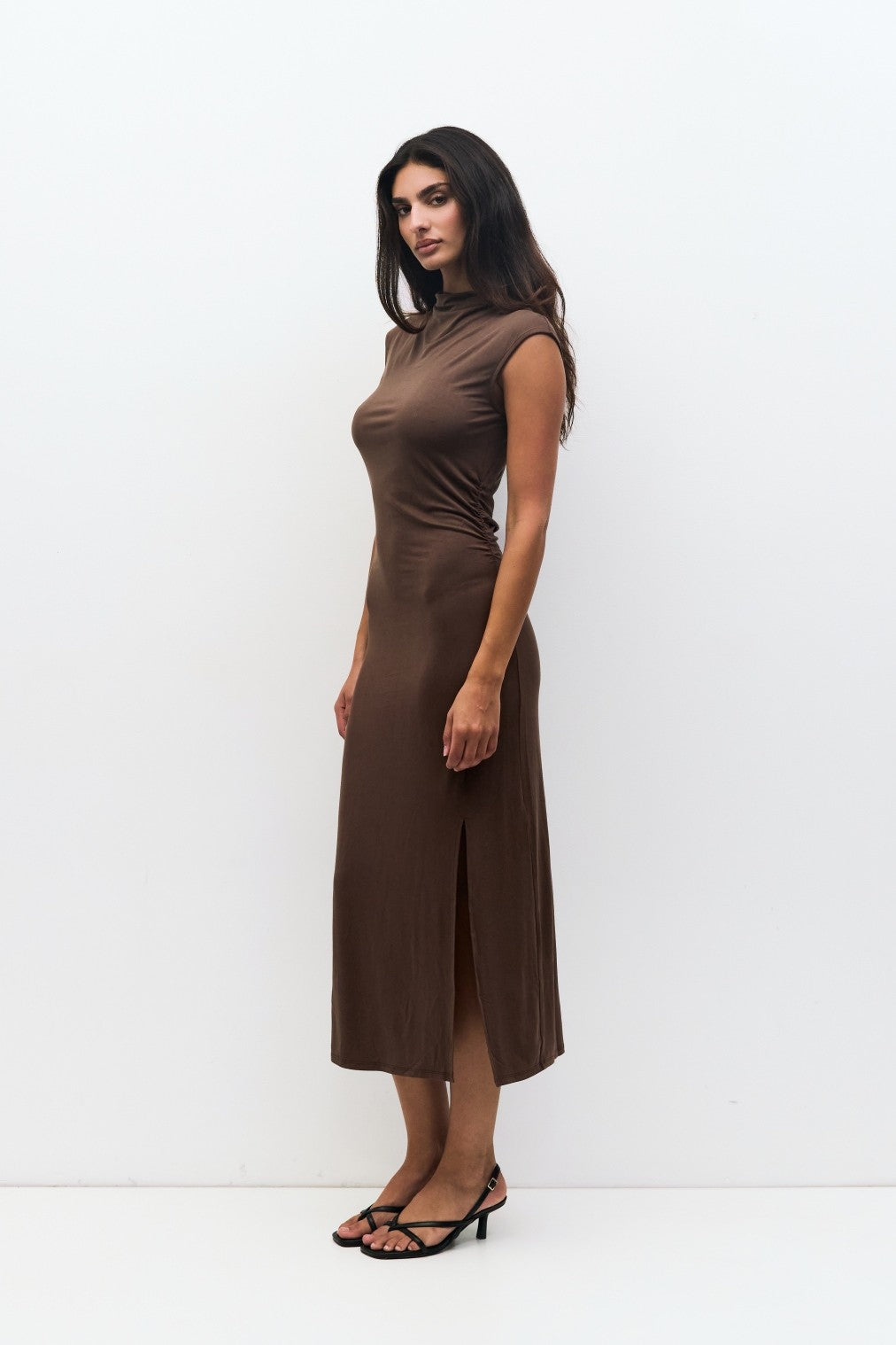 The Lucinda Modal Dress offers a refined silhouette in a soft, lightweight modal fabric. Its sleek, body-con design is enhanced by side-front shirring that sculpts the shape subtly yet effectively. Featuring a sleeveless cut and a sophisticated cowl mock neck, this maxi dress ensures both comfort and elegance. A discreet front slit adds ease of movement while maintaining a polished appearance, making it an ideal choice for occasions requiring understated sophistication.