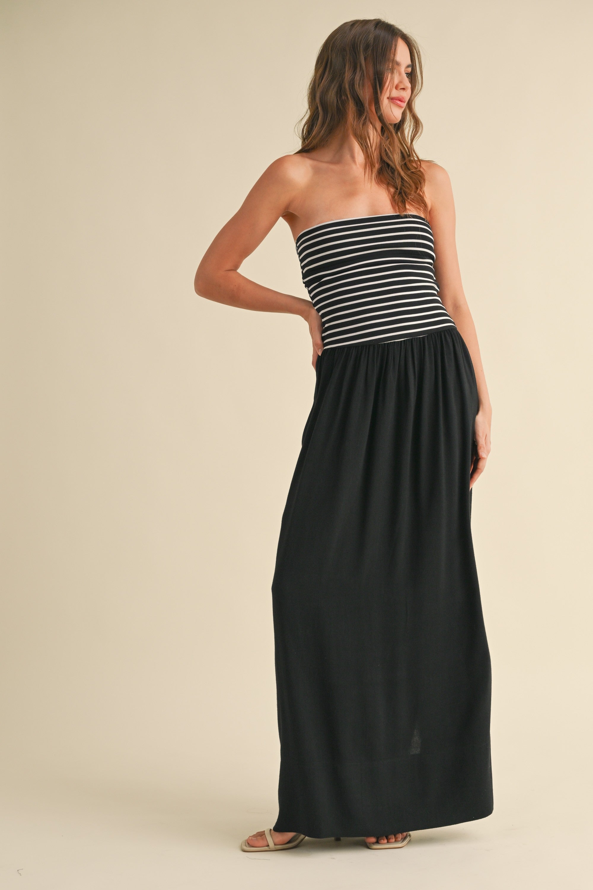 Expertly crafted with a striped top bodice and solid skirt, the Zach Mixed Maxi provides a stylish yet versatile look. Made from 97% TENCEL and 3% SPANDEX, this dress offers a comfortable fit and sustainable fabric that is both soft and stretchy. Perfect for any occasion, the Zach Mixed Maxi is a must-have addition to your wardrobe.
