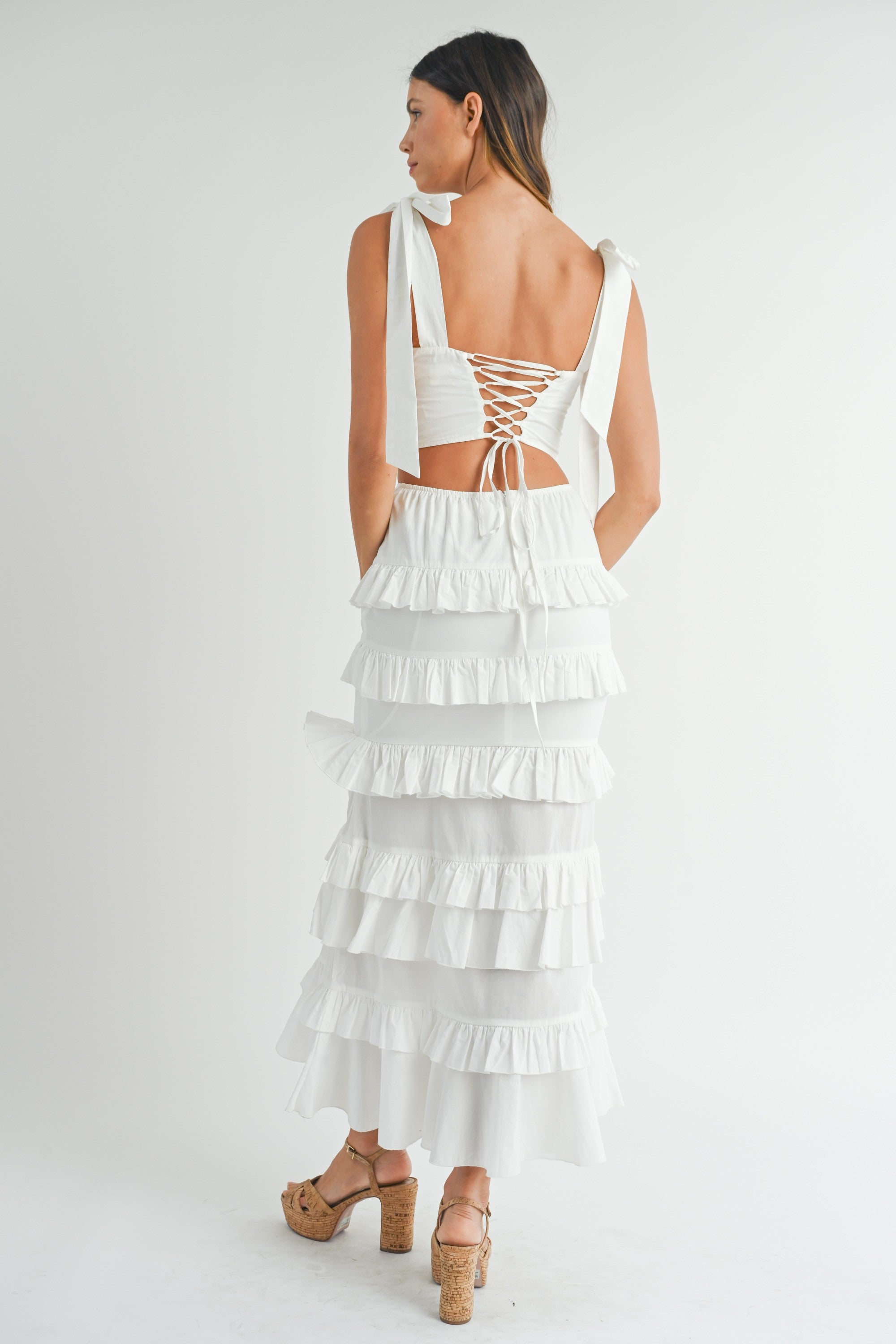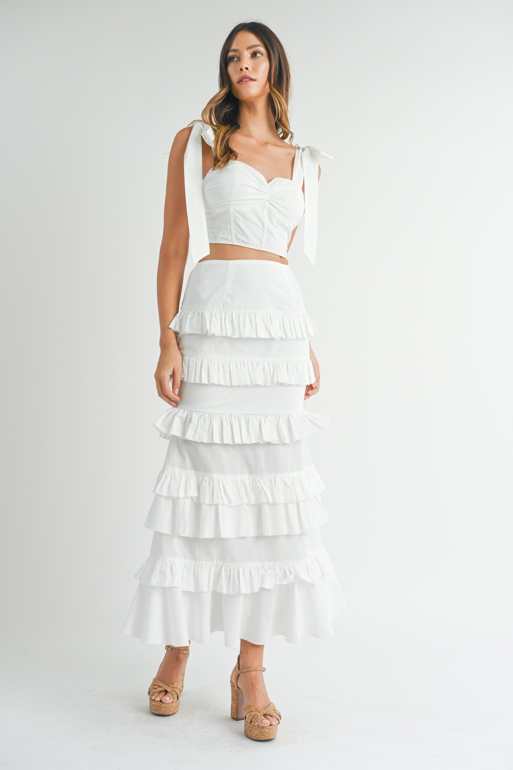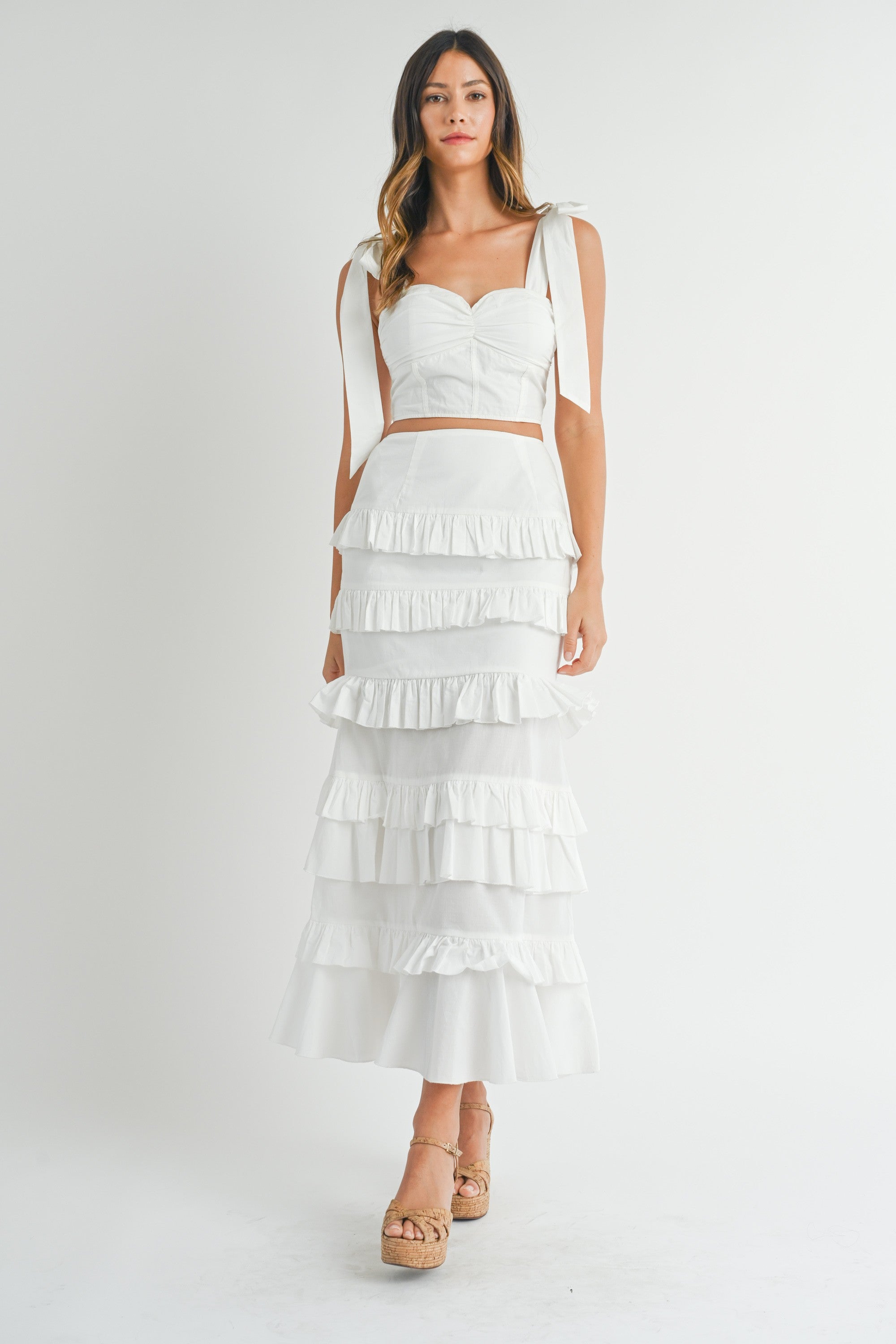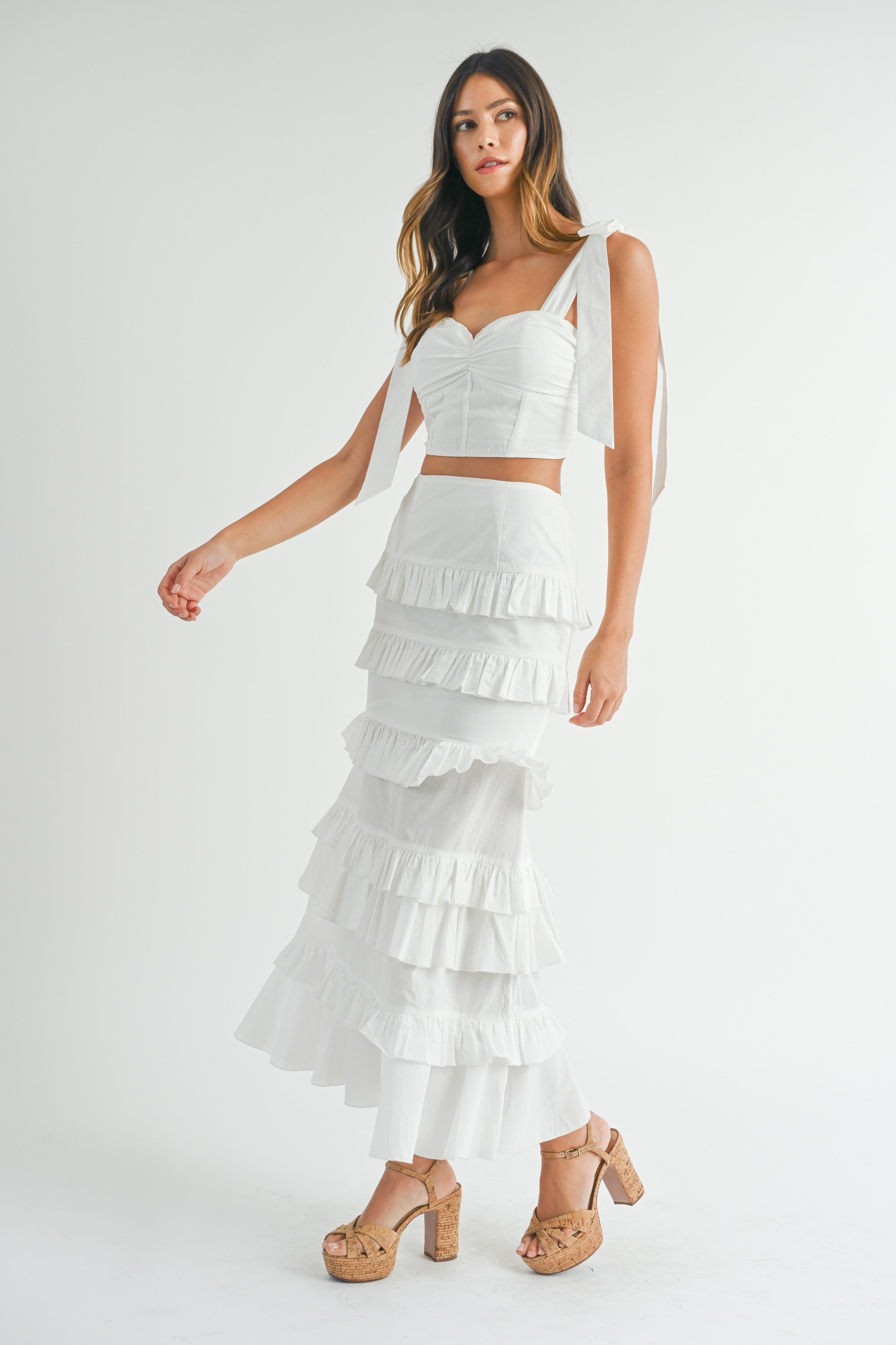 This Pargie Ruffle Set features a solid poplin crop top with a self-tie shoulder strap, sweetheart neckline, and back lace up for a stylish and comfortable fit. Paired with a matching ruffle tier maxi skirt, this set is a must-have for any fashion-forward individual. Elevate your wardrobe with this versatile and chic ensemble.