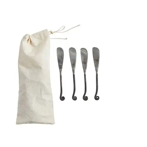 Hand-forged stainless steel canapé knives designed for refined entertaining. This set of four features sleek black handles and precisely balanced 6-1/4" that glide through delicate appetizers with minimal effort. Each knife showcases superior craftsmanship, making them as visually striking on the table as they are functional in hand. Perfect for serving hors d'oeuvres at dinner parties or upscale events, these knives elevate your presentation while delivering the durability expected from quality serveware.