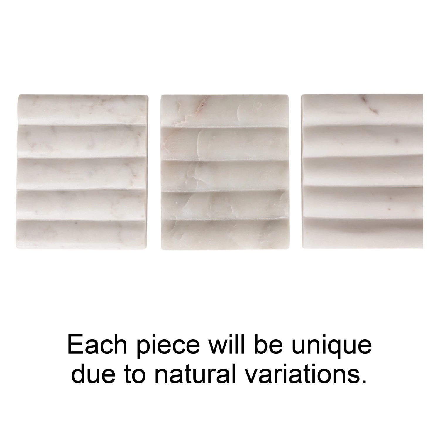 Elevate your bathroom with this carved white marble soap dish, a timeless piece that merges form and function. The thoughtfully grooved surface channels water away naturally while adding visual interest to your vanity. Measuring 5-1/4"L x 4"W, this rectangular design fits seamlessly into contemporary and minimalist interiors. Pair it with coordinating marble accessories to establish a cohesive, spa-like atmosphere. A sophisticated gift choice for those who appreciate quality home accents.