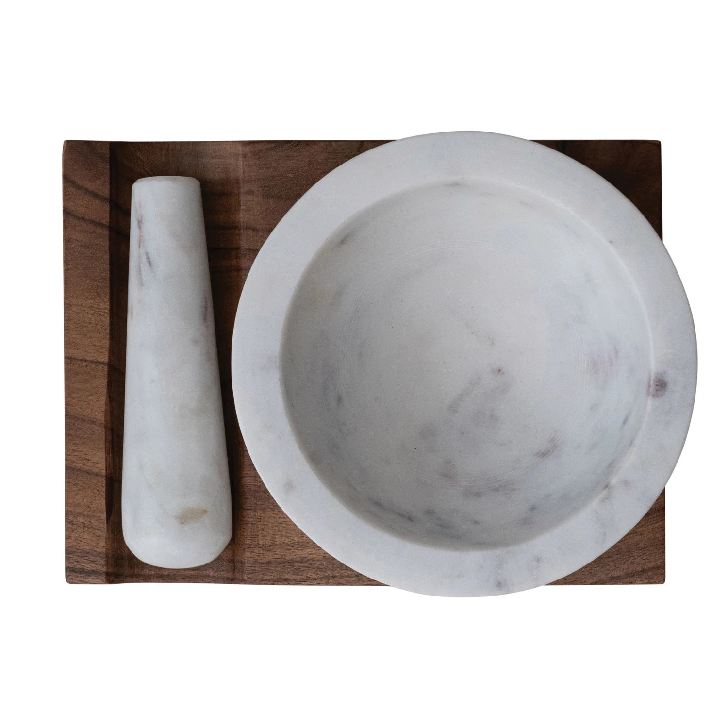 Elevate your culinary technique with this three-piece mortar and pestle collection, expertly crafted to handle grinding, crushing, and blending tasks with precision. Each set features a pristine white marble mortar paired with a matching pestle, mounted on a natural acacia wood base measuring 8"L x 6"W. The inset design keeps ingredients contained while the marble's smooth surface and non-porous composition prevent flavor absorption and ensure easy cleaning. Ideal for spice blending, herb preparation, and sauce creation, this versatile trio brings both functionality and refined aesthetics to any kitchen.