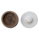 Handcrafted from natural mango wood, this charming pinch pot combines rustic appeal with functional design. Measuring 3 inches in diameter and 2¾ inches tall, it's perfectly sized for storing small treasures, spices, or tabletop essentials. The contrasting enameled lid in crisp white provides a clean finish while protecting contents from dust and moisture. The organic wood grain and minimalist aesthetic make it an understated addition to any kitchen or shelf display. Ideal for those who appreciate artisanal craftsmanship and sustainable materials.
