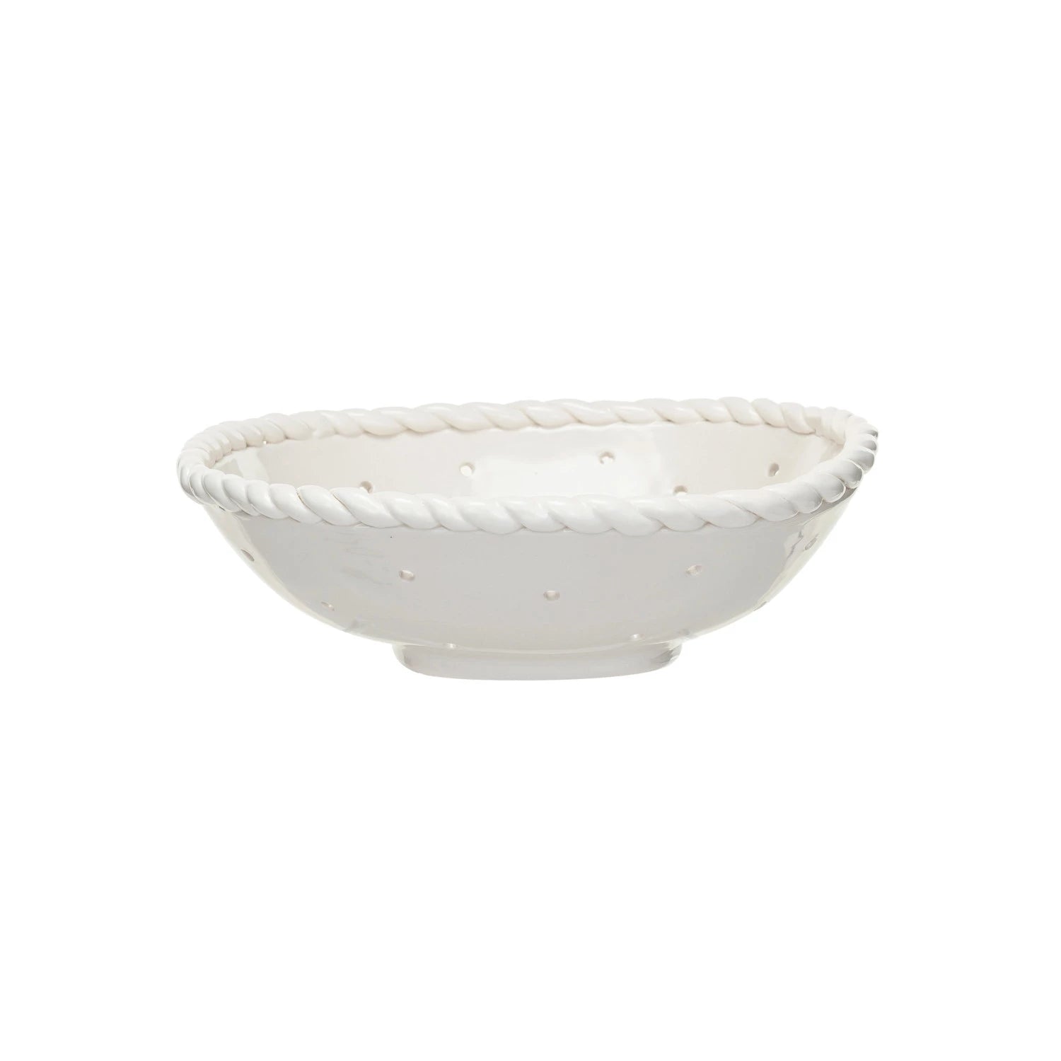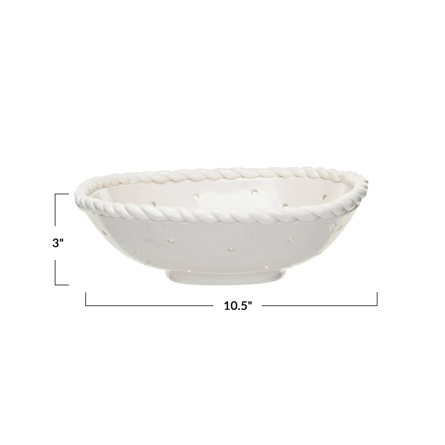Elevate your kitchen workflow with this professionally-designed stoneware colander. Engineered at 10-1/2" by 8-3/4" by 3" deep, it delivers substantial capacity without compromising counter space. The signature hand-twisted rim enhances both structural integrity and visual sophistication, distinguishing it from mass-produced alternatives. Constructed from high-fired stoneware, this piece exhibits superior durability and thermal stability. Its pristine white finish provides a neutral canvas that harmonizes with contemporary and classic kitchen environments alike, making it an essential tool for serious home cooks.