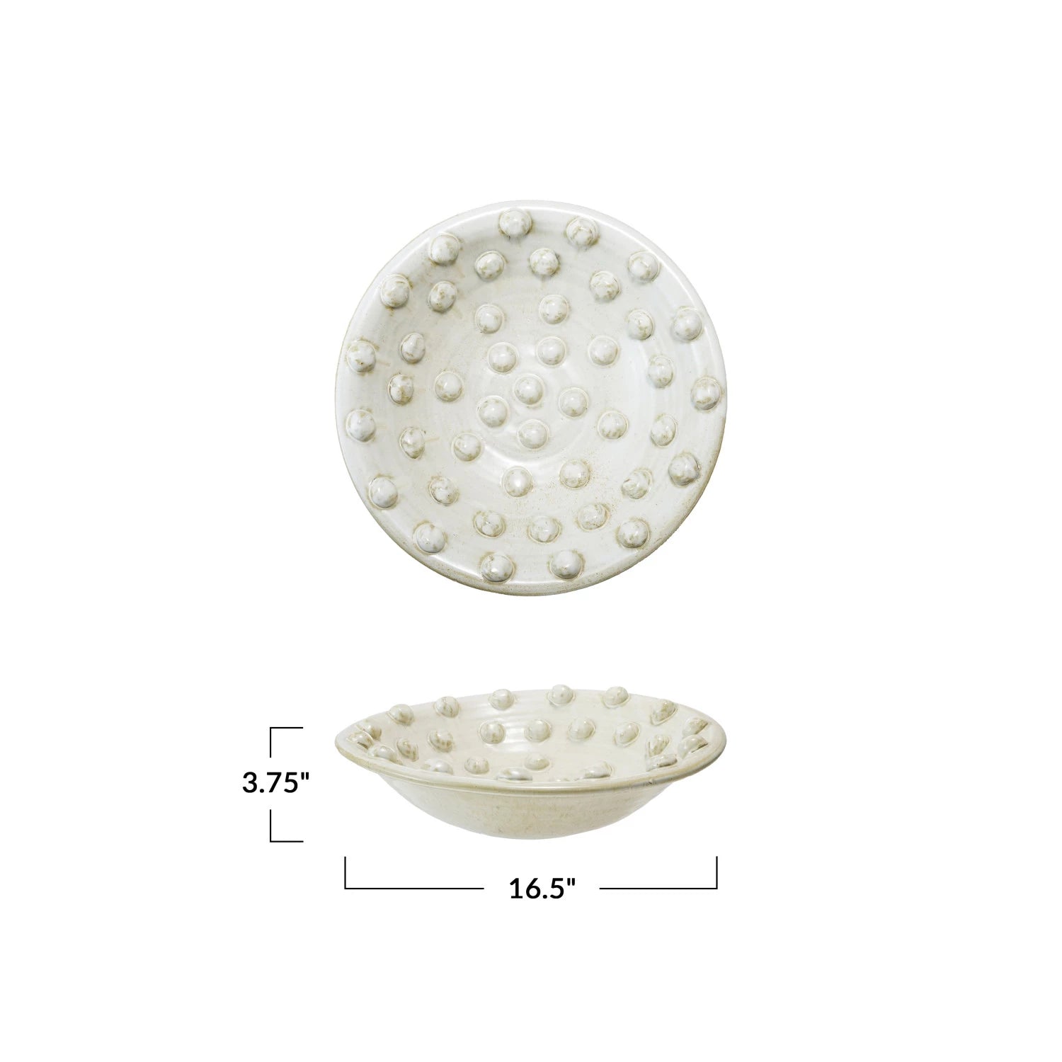 This glazed terracotta bowl showcases expert craftsmanship with its handmade design, featuring raised dots and a reactive cream-colored glaze. Measuring 16-1/2" in diameter and 3-3/4" in height, each bowl varies subtly, reflecting the unique nature of artisanal production. Its low profile and textured surface make it an elegant focal point for decorative or functional use.