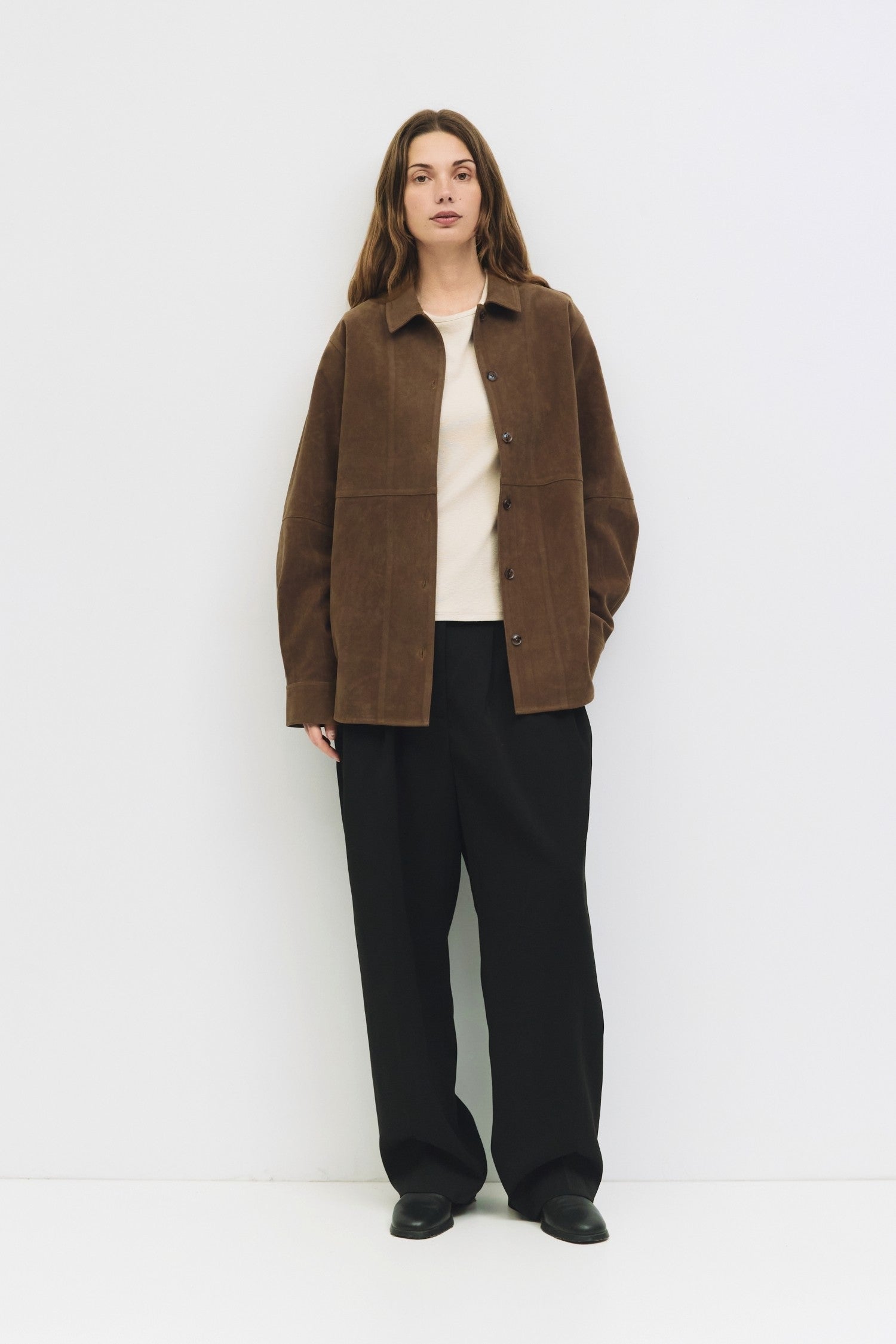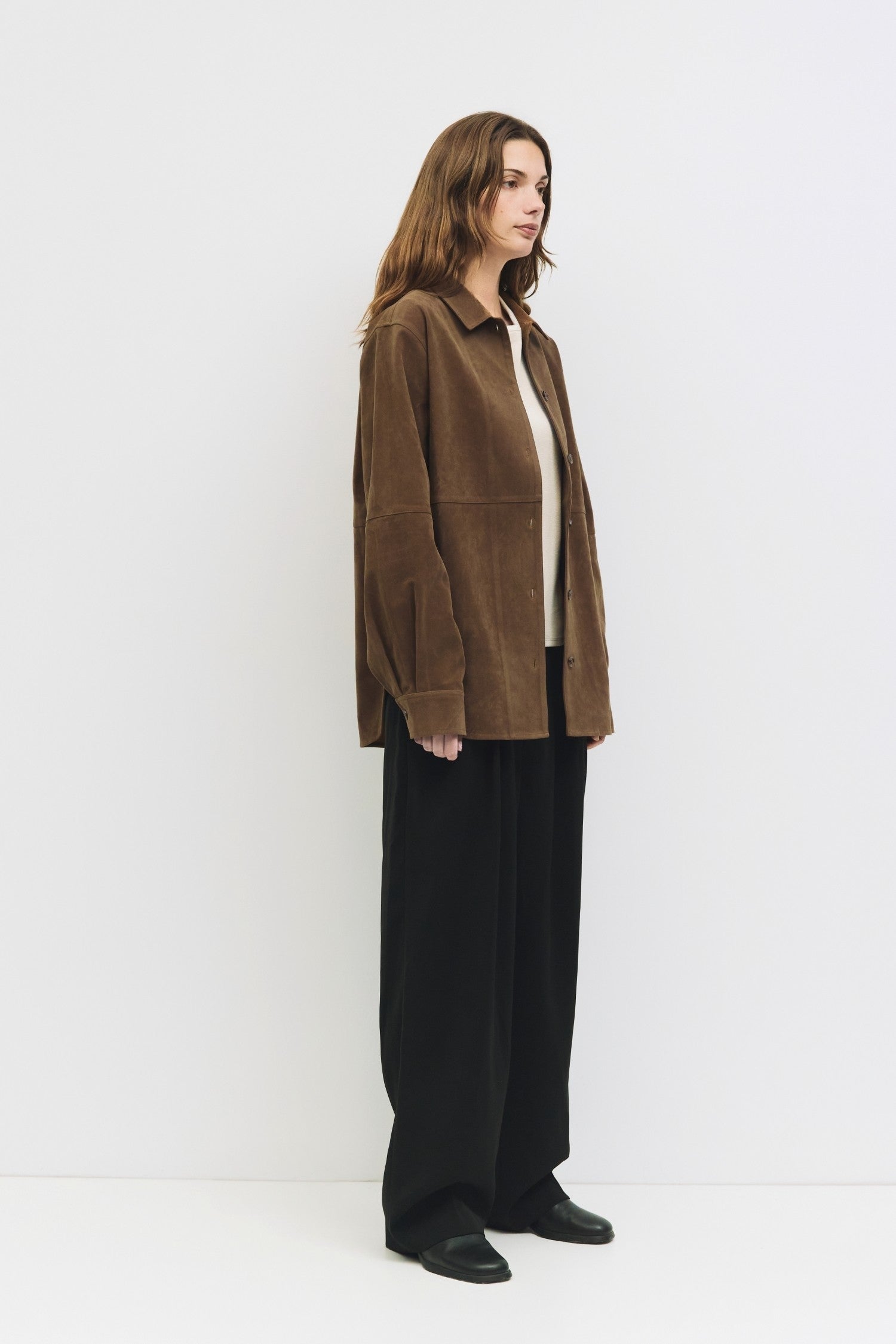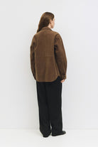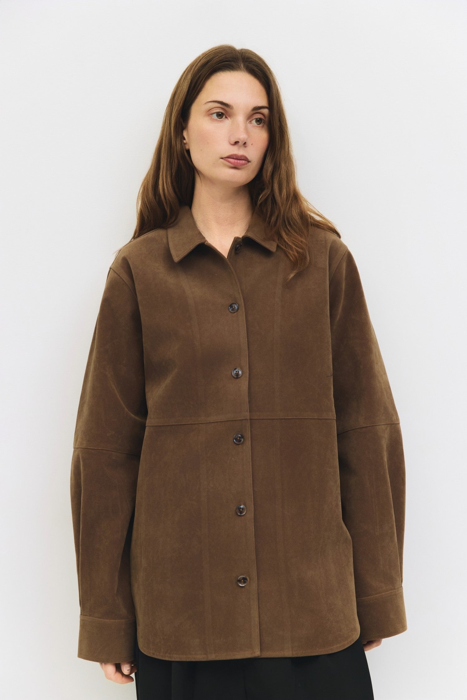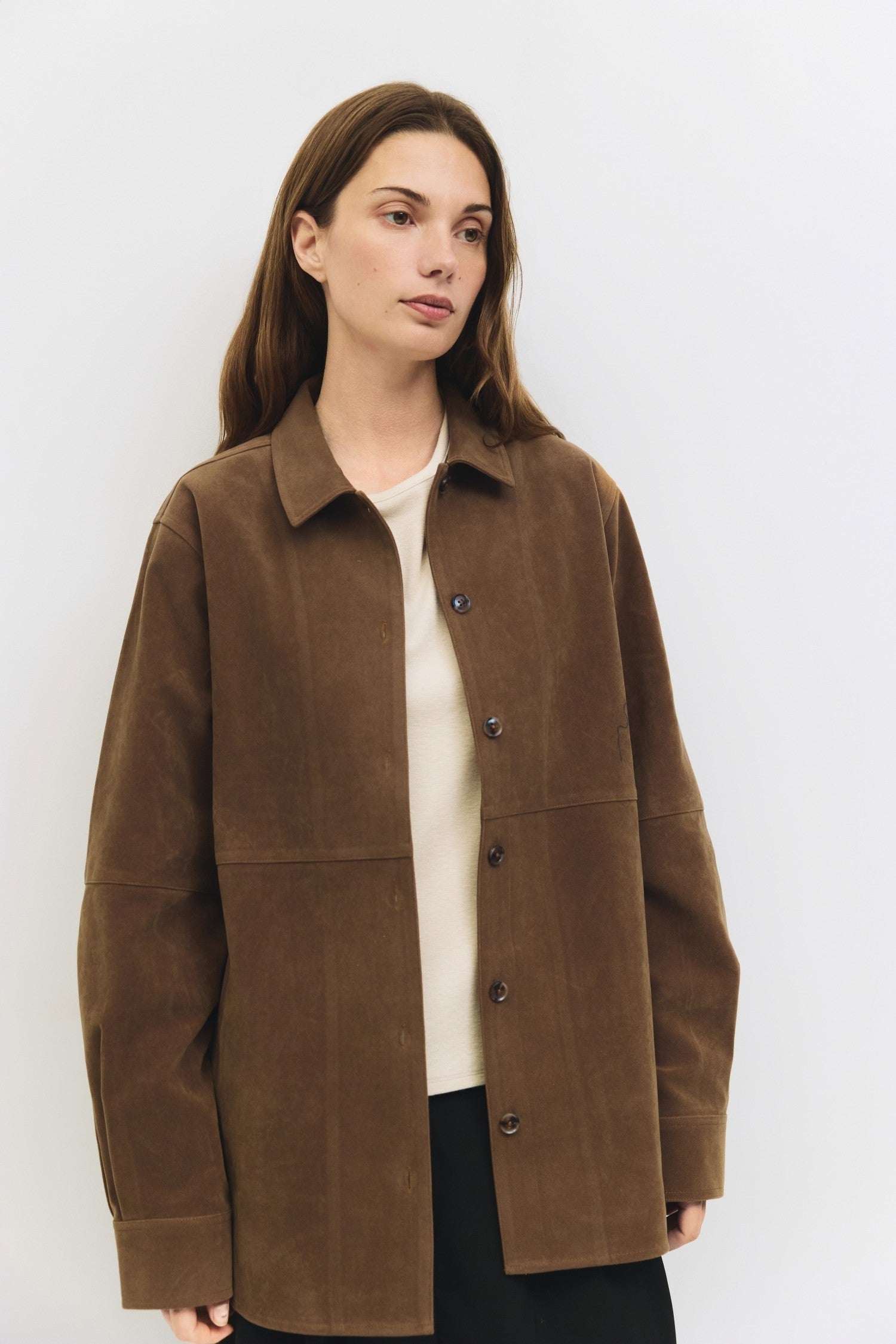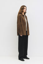 The Aster Suede Jacket combines effortless sophistication with everyday versatility. Crafted from luxuriously soft faux suede, this oversized button-down features a timeless collar and extended sleeves that drape beautifully. Its relaxed silhouette makes it an ideal layering essential—wear it open over basics for added texture and dimension, or button it up for a polished look. Perfect for transitional seasons and casual-to-smart styling.