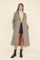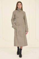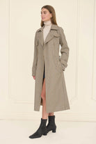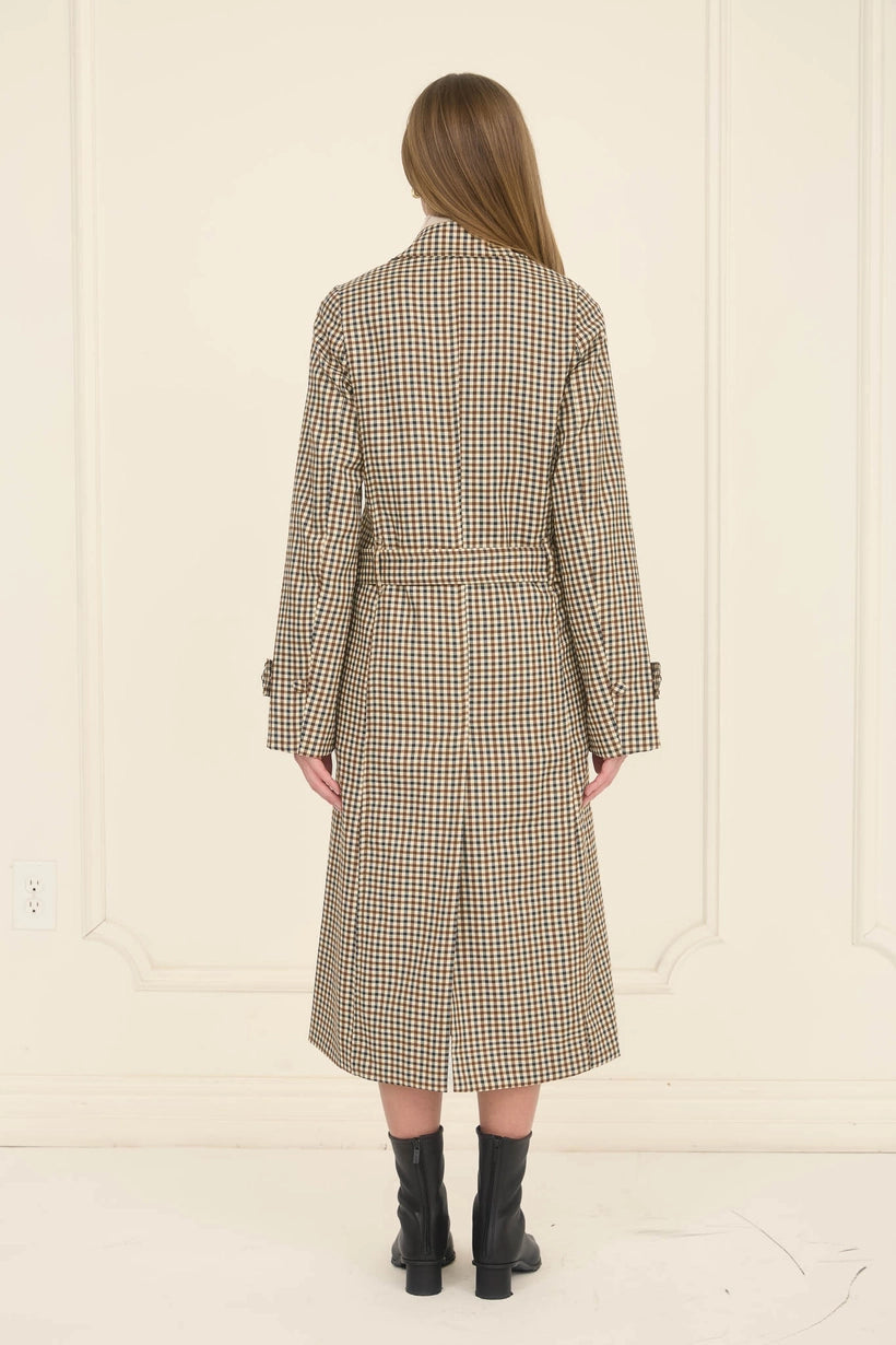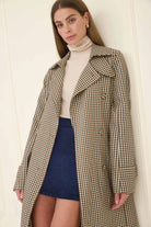 The Claudia Plaid Trench combines timeless tailoring with contemporary style. This structured outerwear piece features a classic notch collar, functional button closures, and a coordinating belt to define your silhouette. Long sleeves and lined construction provide warmth and durability, while practical pockets add everyday functionality. The sophisticated plaid pattern elevates any ensemble, making this trench a versatile layer for transitional seasons and beyond.