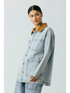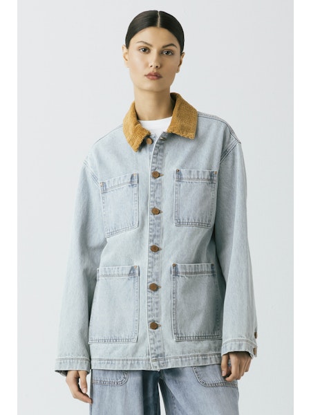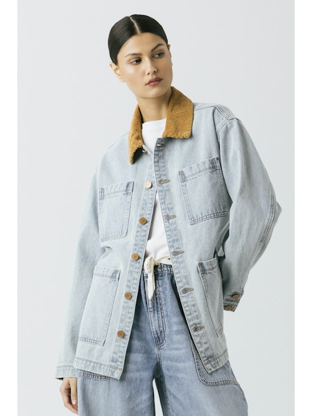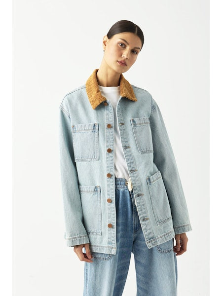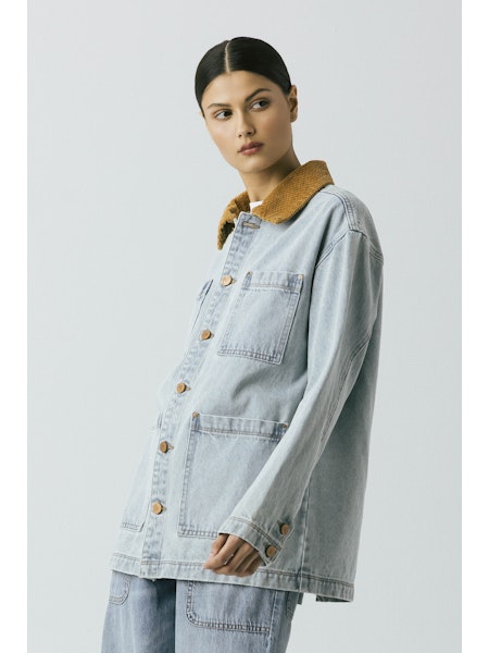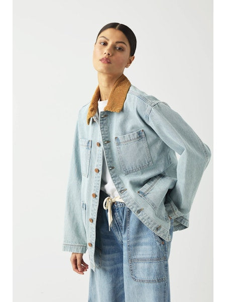 The Crack of Dawn Denim Utility Jacket combines classic workwear styling with refined details. Crafted from durable denim, this jacket features a distinctive corduroy collar that adds texture and visual interest. The utility-inspired design includes functional pockets and a structured fit, making it equally suited for weekend wear or layering over work shirts. Versatile enough to transition across seasons, this piece anchors any casual wardrobe with timeless appeal and dependable construction.