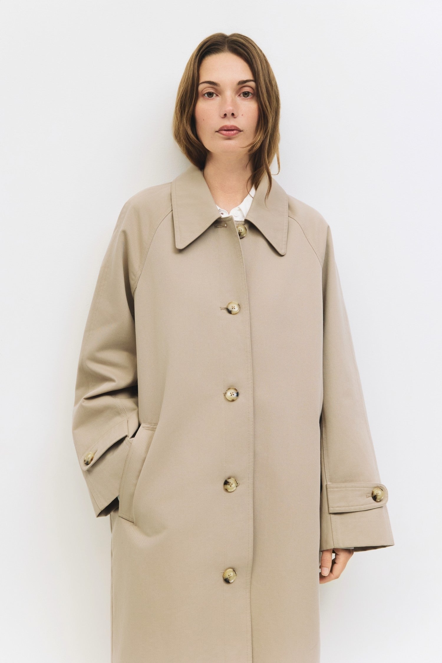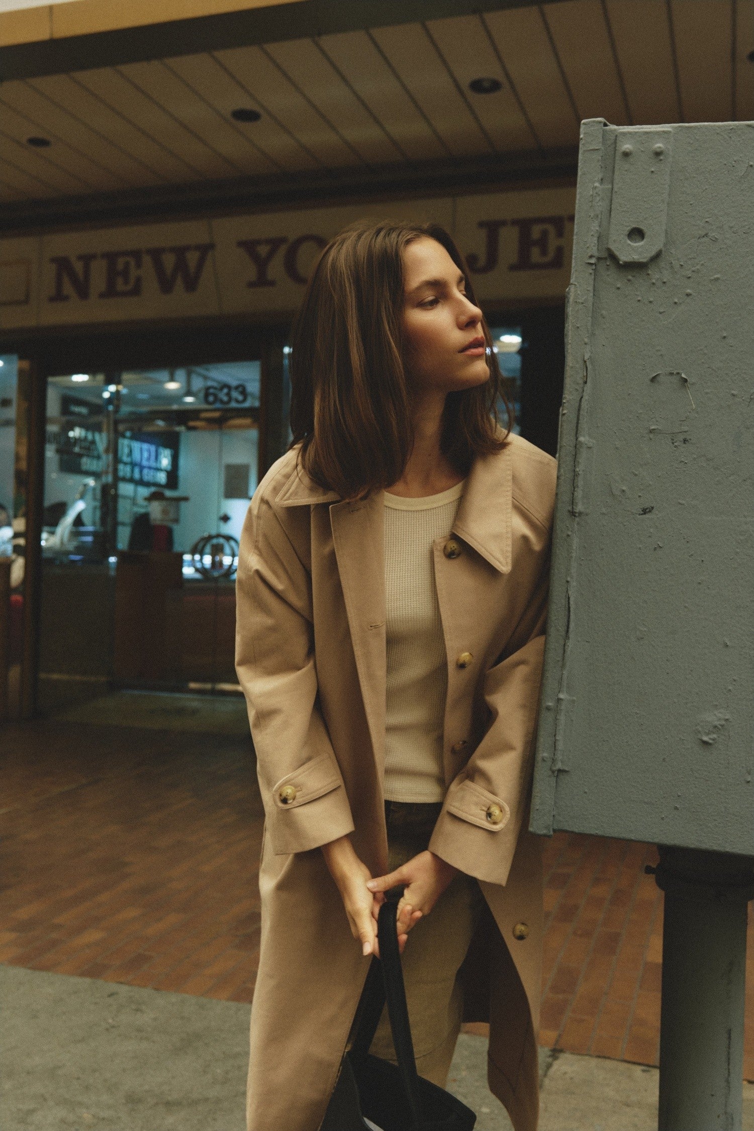 The Enzo Trench expertly combines classic tailoring with modern comfort. Its pointed collar and raglan sleeves create a relaxed yet polished silhouette, while adjustable cuffs and welt pockets add functional detail. Designed with a back slit and midi length, this trench coat offers versatile layering options for a sophisticated, effortless look.