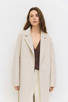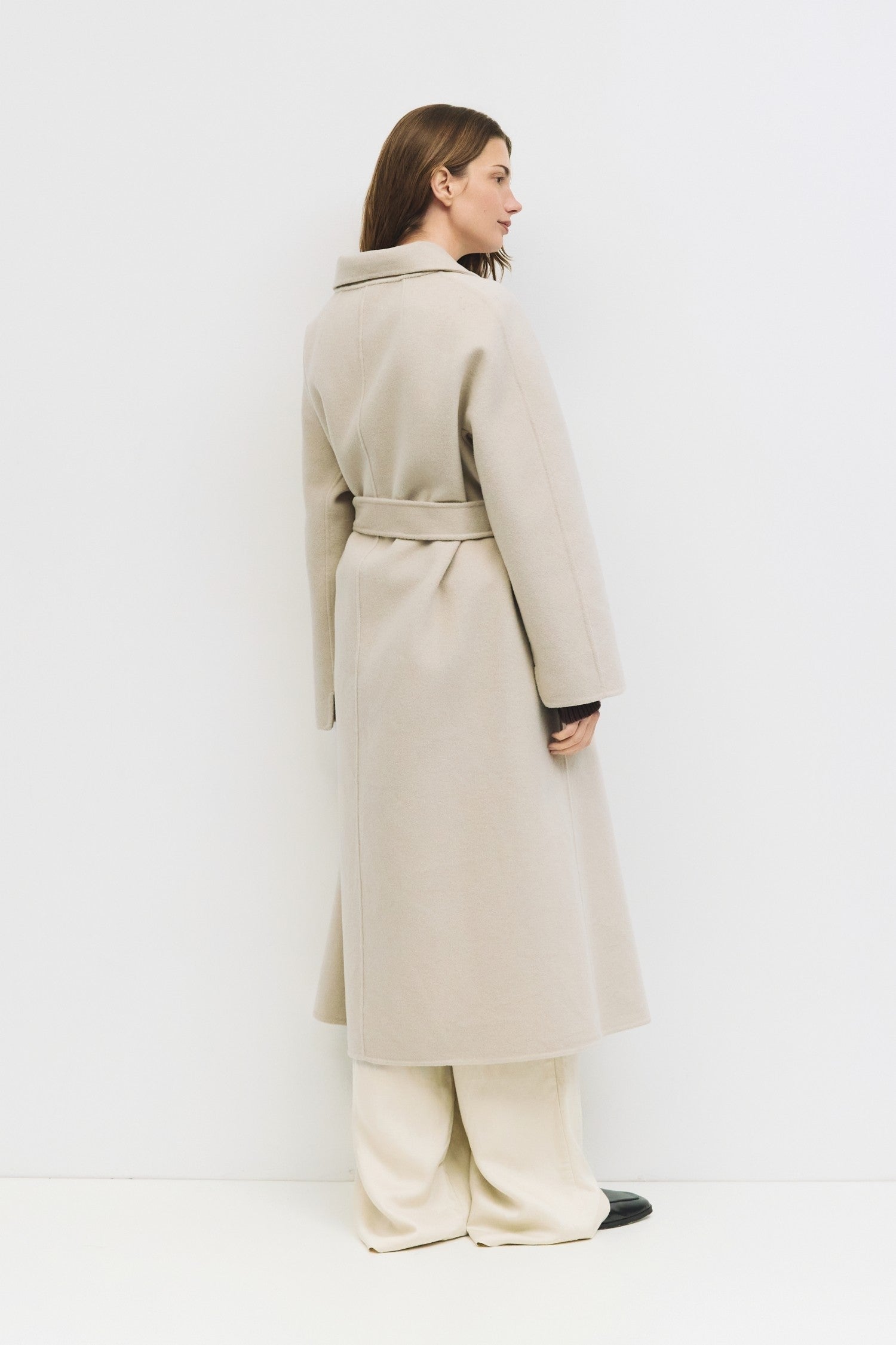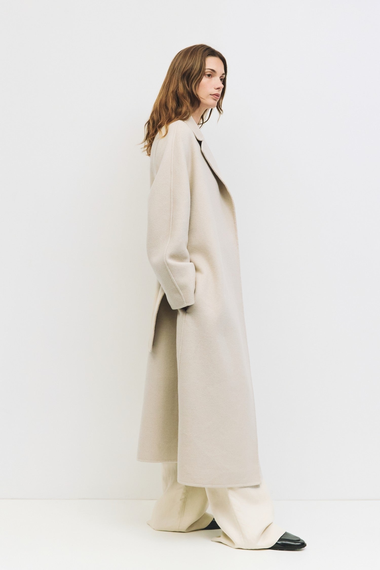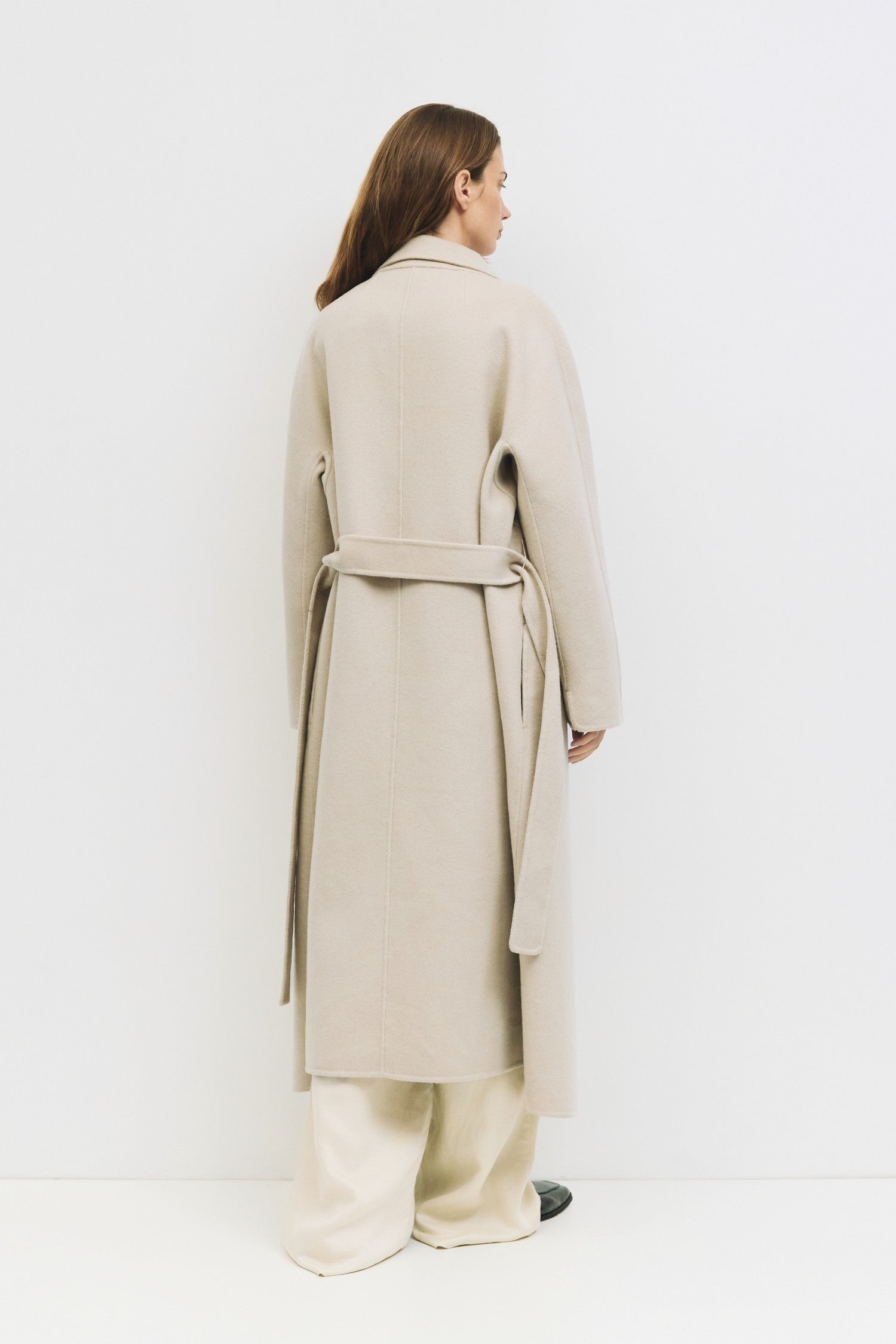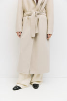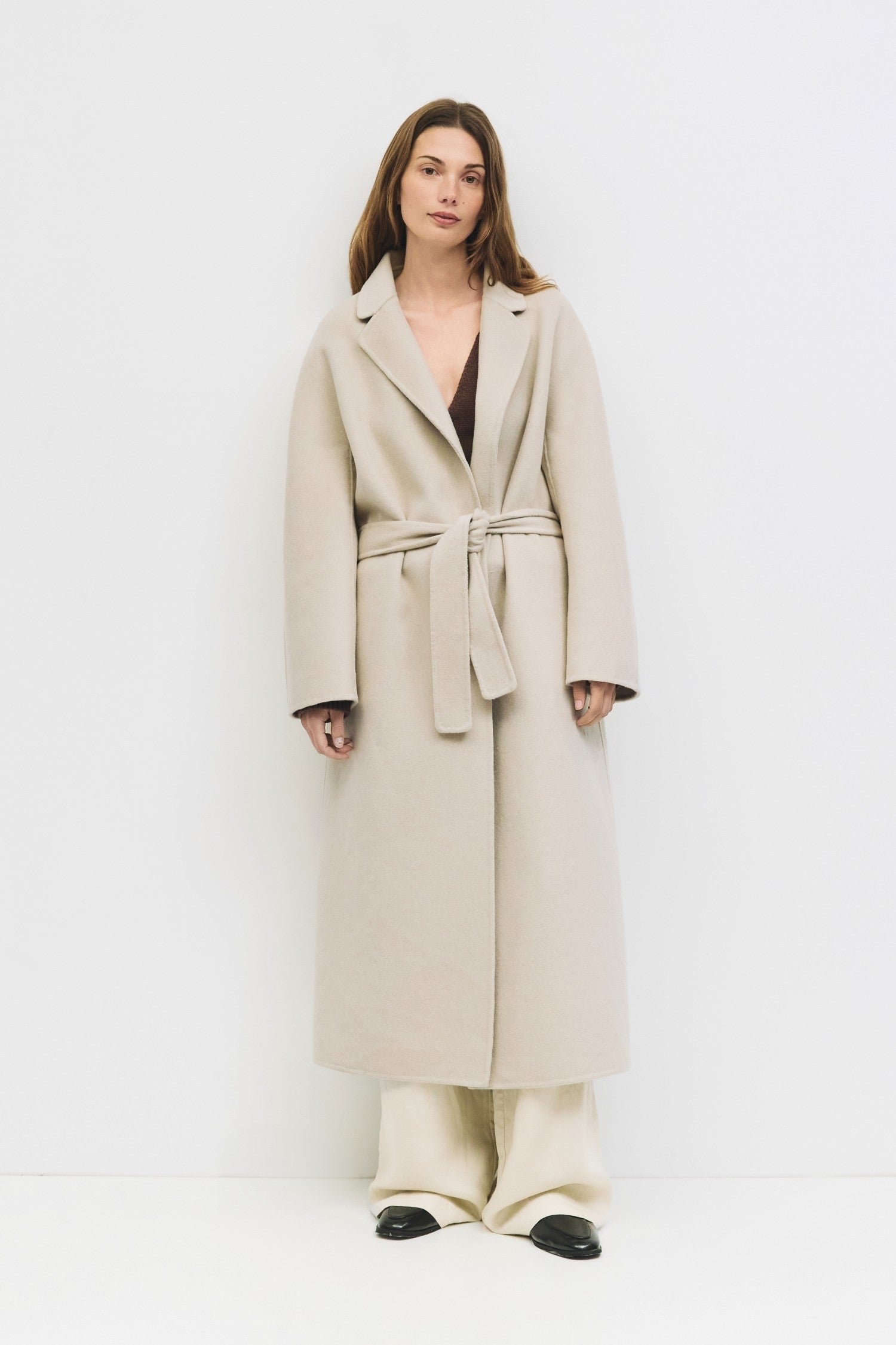 The Kara Wool Wrap Jacket is crafted from heavyweight felted wool, offering both structure and exceptional warmth. Featuring a classic lapel collar and a tie wrap waist, it provides a tailored yet comfortable fit. Two side slit pockets add practical functionality, making this oversized coat a sophisticated choice for cold-weather layering.