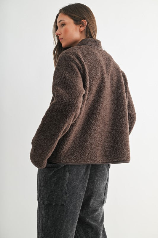 The Shilo Sherpa Jacket merges understated elegance with practical warmth. Featuring a plush sherpa and structured button-front design, this piece offers refined layering for unpredictable weather. The tailored silhouette works equally well over fitted basics or relaxed separates, making it a versatile addition to any wardrobe. Built for durability and comfort, it transitions seamlessly across seasons and occasions. An investment piece that delivers both style and substance.