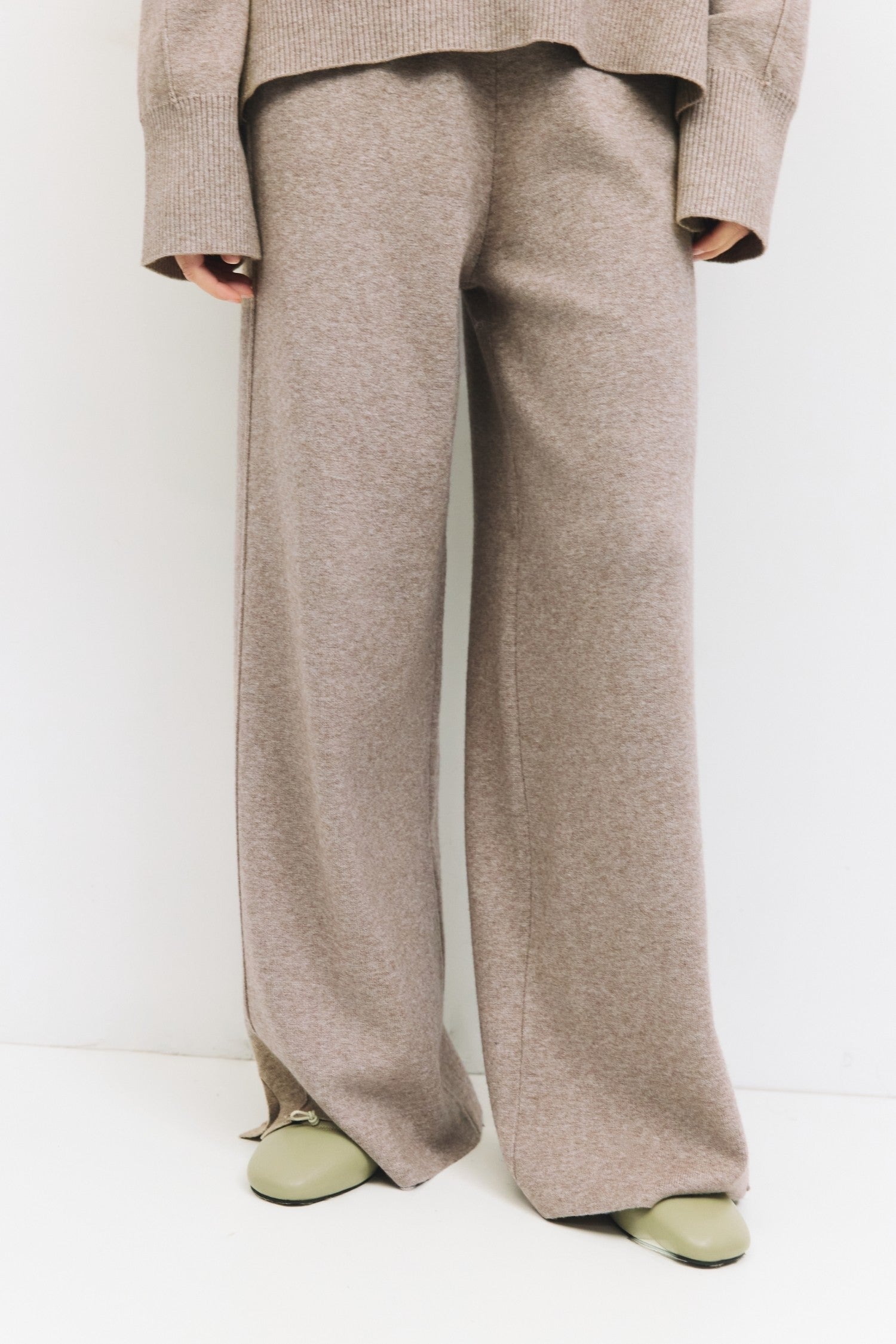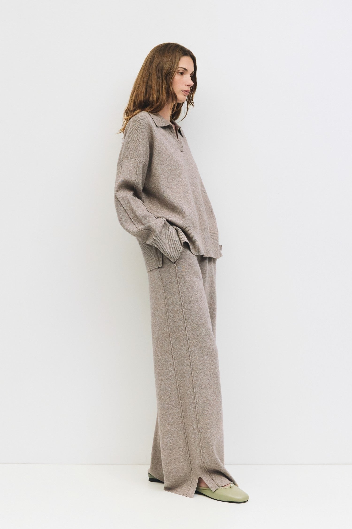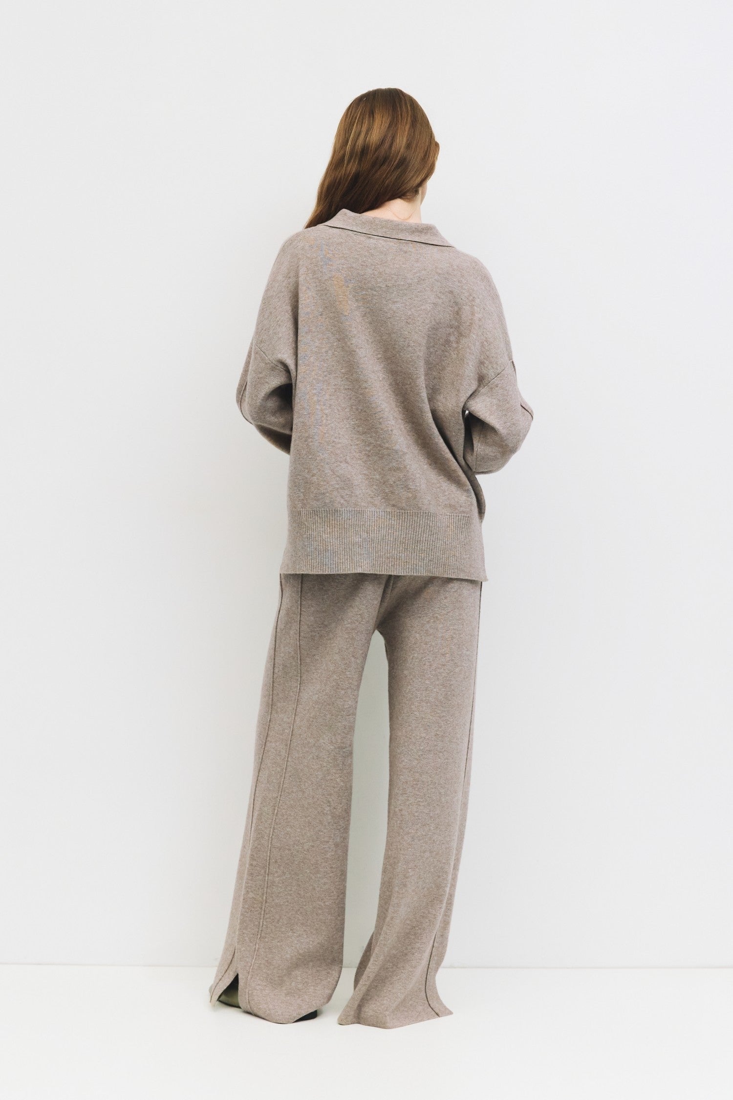 The Daphne Knit Sweater offers a relaxed fit, featuring a classic Johnny collar neckline and long sleeves detailed with elegant piping. Crafted from midweight brushed knit, it provides both warmth and softness, while side slits enhance mobility and comfort. Designed to coordinate perfectly with matching pants, this sweater combines refined style with everyday ease.