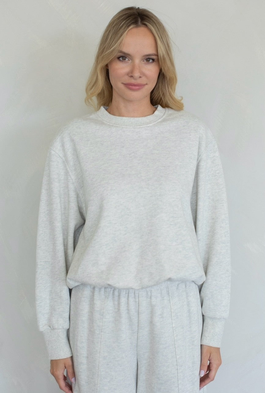 The Jenna Bubble Hem Sweatshirt, in a heather oat hue, offers a refined take on casual comfort. Its distinctive bubble hem adds a subtle yet stylish silhouette, making it ideal for both lounging and casual outings. For a cohesive, elevated look, pair it seamlessly with the matching sweatpants, creating a coordinated ensemble that balances comfort and contemporary design. This set is perfect for those seeking relaxed sophistication in their everyday wardrobe.