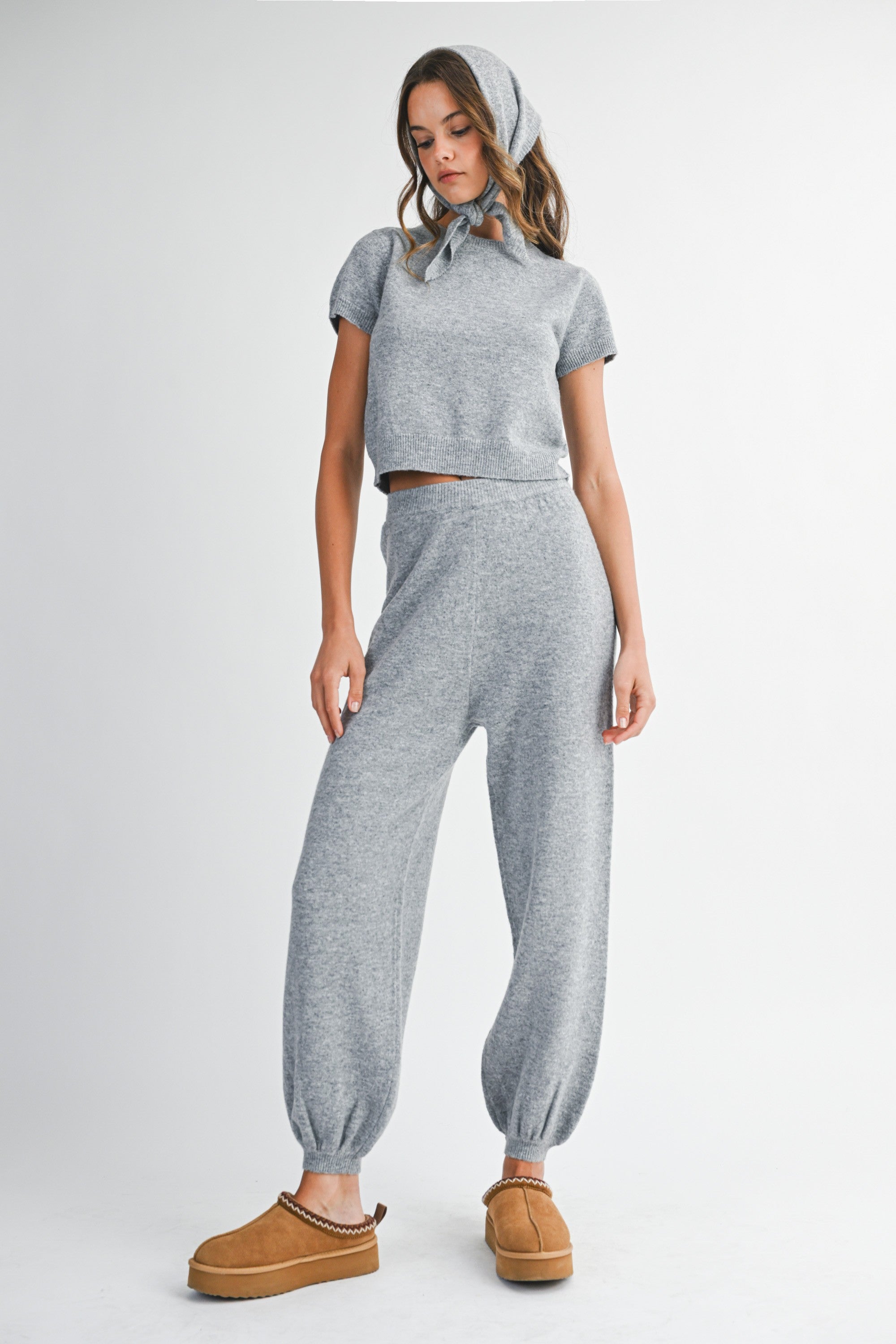 The Sanders Knit Set features a solid knit design with a short sleeve crop sweater paired with matching jogger pants for a coordinated, comfortable look. This versatile three-piece set includes an optional scarf that can be styled around the neck or in the hair, adding a refined touch. Crafted for both style and ease, it seamlessly blends casual comfort with polished appeal.