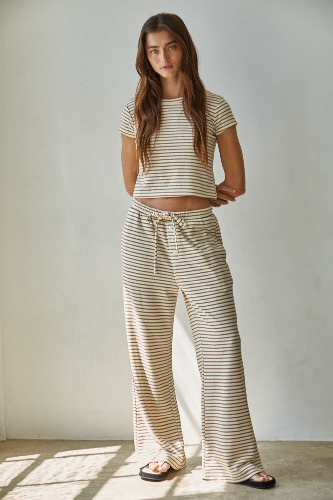 These Sundays Lounge Pants combine comfort and style with a flattering flare silhouette. Featuring convenient side pockets, a waist tie strap for a customizable fit, and distinctive J stitch buttons, they offer both functionality and refined detailing. The striped pattern adds a modern touch, making them ideal for relaxed yet polished looks. Crafted to provide ease of movement while maintaining a tailored appearance, these pants are a versatile addition to any wardrobe.