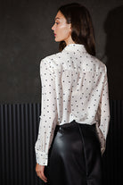 Timeless elegance meets everyday versatility in this classic polka dot button-down blouse. The allover polka dot print adds a touch of sophistication while the lightweight woven fabric drapes beautifully against the body.