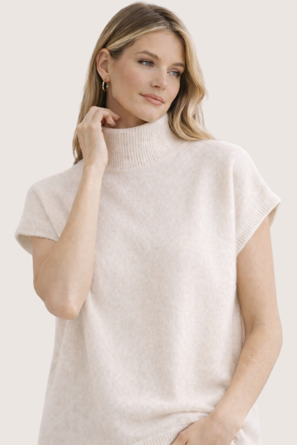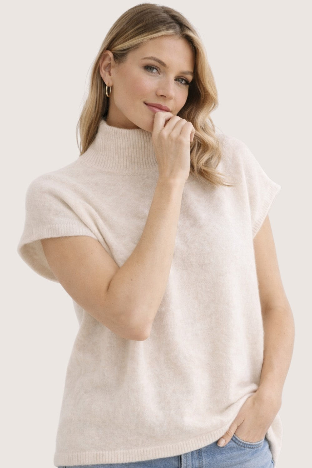 This refined knit top features a modern mock neckline and flattering cap sleeves, creating a clean and sophisticated silhouette. The soft knit fabric offers comfortable stretch and a smooth texture, making it perfect for everyday wear.