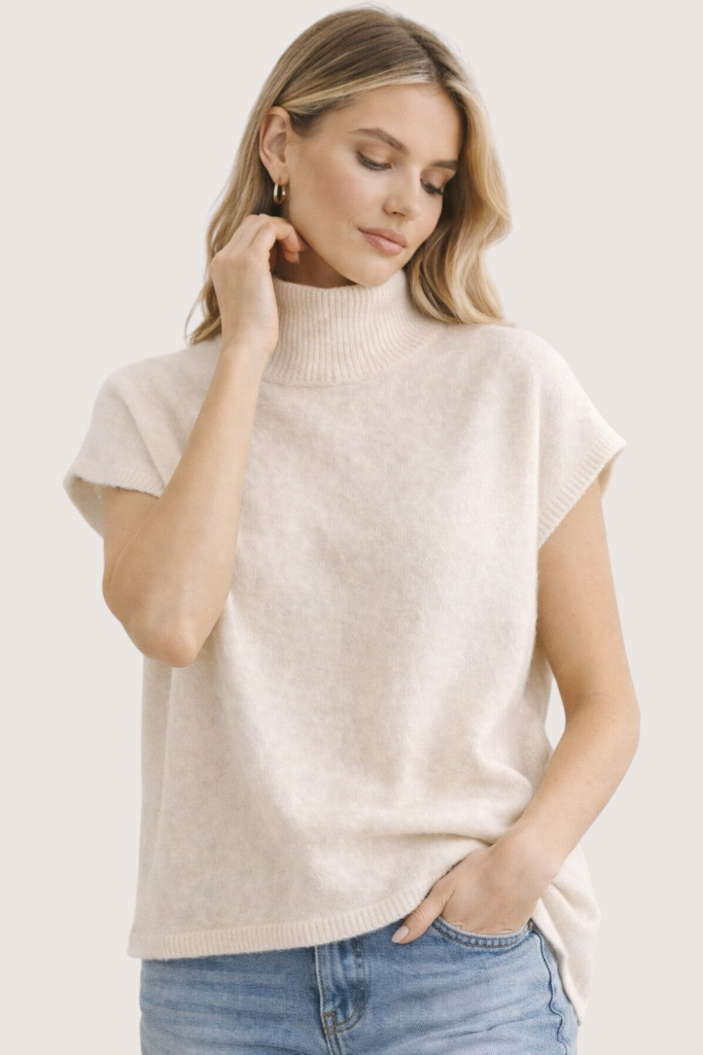 Elegant mock neck knit sweater top designed for effortless boutique styling.