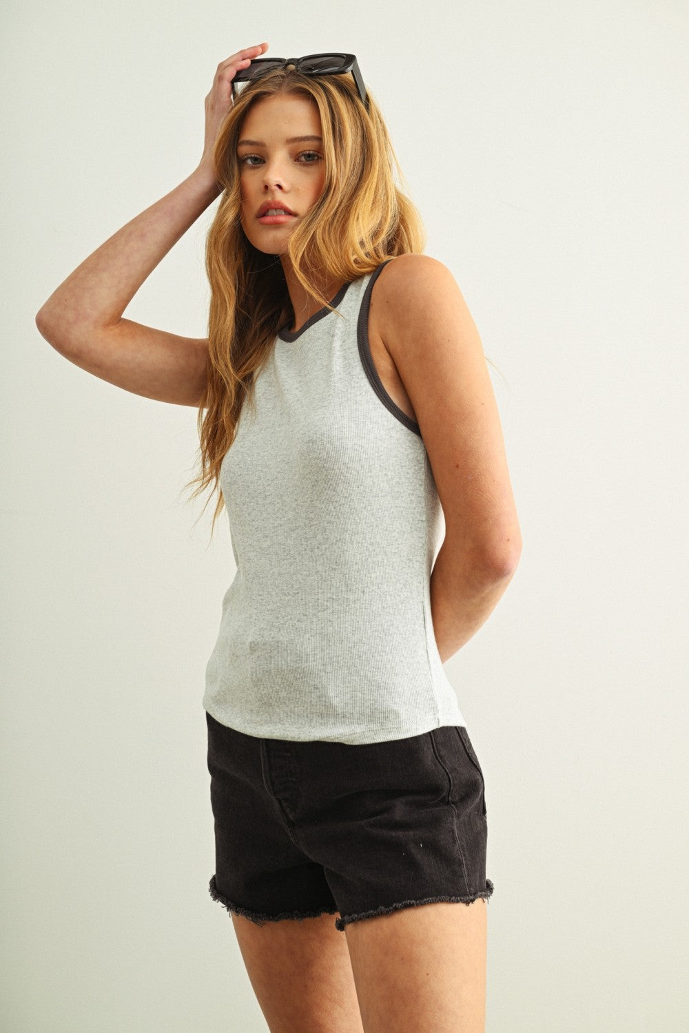 Effortless style meets everyday comfort in the Shelby Contrast Tank. This classic sleeveless piece features a relaxed fit with charcoal trim detailing that adds visual interest and dimension. Perfect for layering or wearing solo, it transitions seamlessly from casual days to weekend outings. The breathable fabric keeps you cool while the contrast accents elevate your basic wardrobe staple.