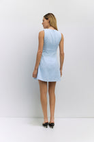 Elevate your wardrobe with the Tyler Powder Mini, a sophisticated sleeveless dress crafted from textured plaid fabric. This fully lined piece features a flattering V-neck, eye-catching front twist detail, and a fitted waist that defines your silhouette. The mini length offers a modern, versatile look perfect for any occasion, while the center back invisible zipper ensures a seamless finish. A timeless essential with contemporary style.