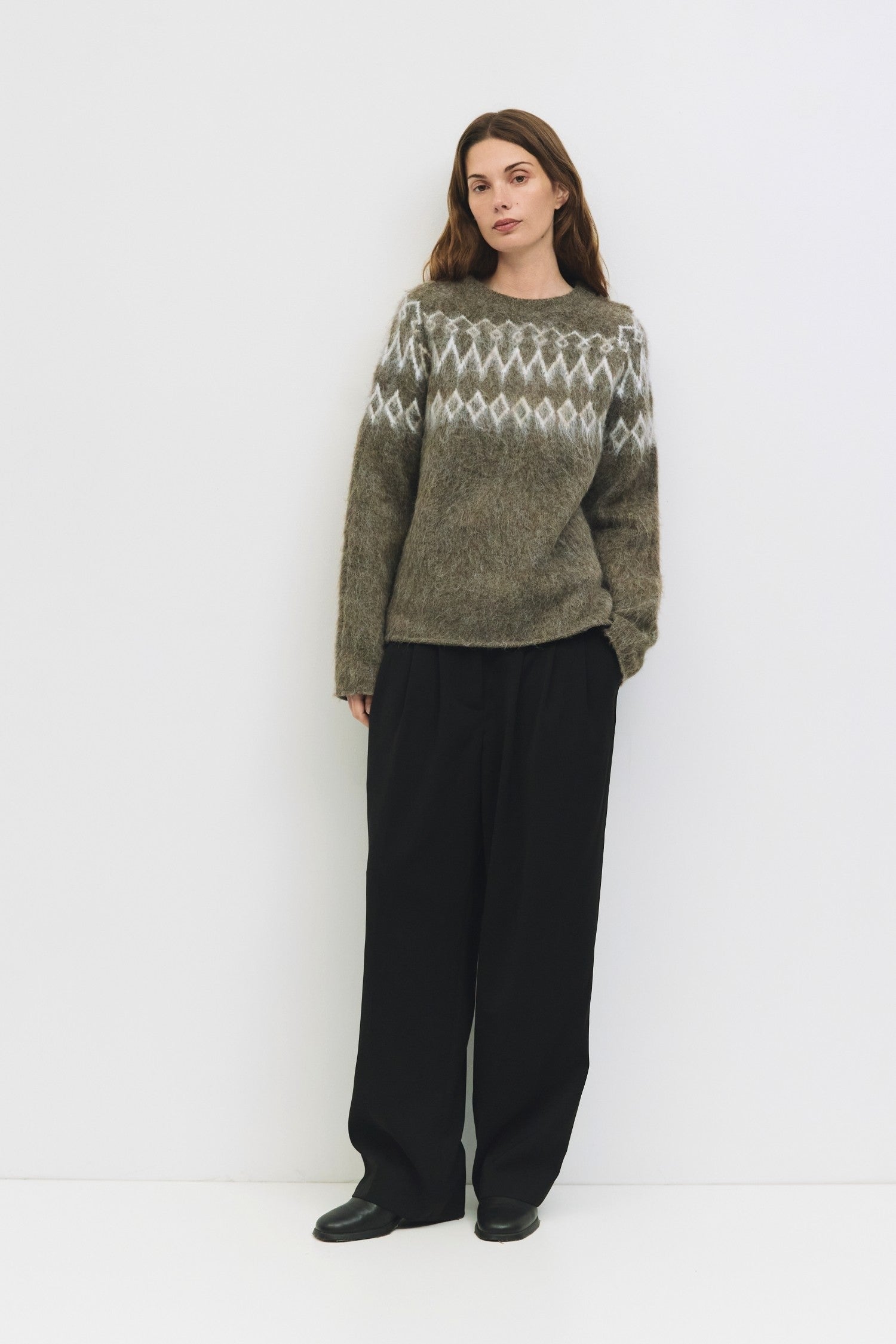 The Asher Fair Isle sweater features a timeless Fair Isle pattern enhanced by a soft, textured finish that adds warmth and depth. Its relaxed fit and long sleeves provide comfortable layering for cooler days, making it an ideal choice for effortless style and cozy wear throughout the season.