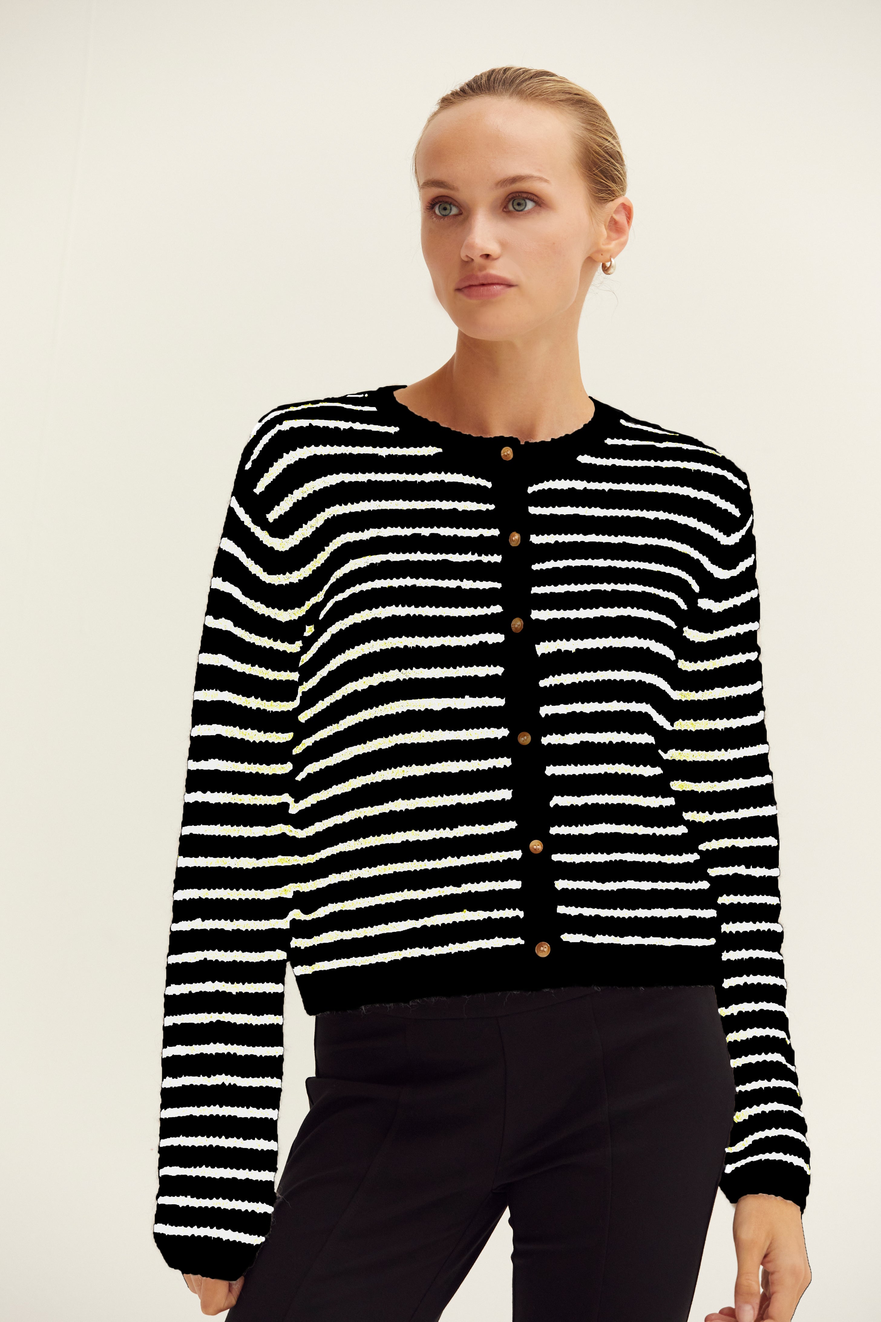 The Riley Button Down Cardi features a classic striped design combined with a button-down front for easy layering. Crafted for versatility and comfort, this cardigan offers a refined silhouette suitable for both casual and professional settings. Its breathable fabric ensures all-day wearability, while the stripes add a timeless touch to your wardrobe essentials.
