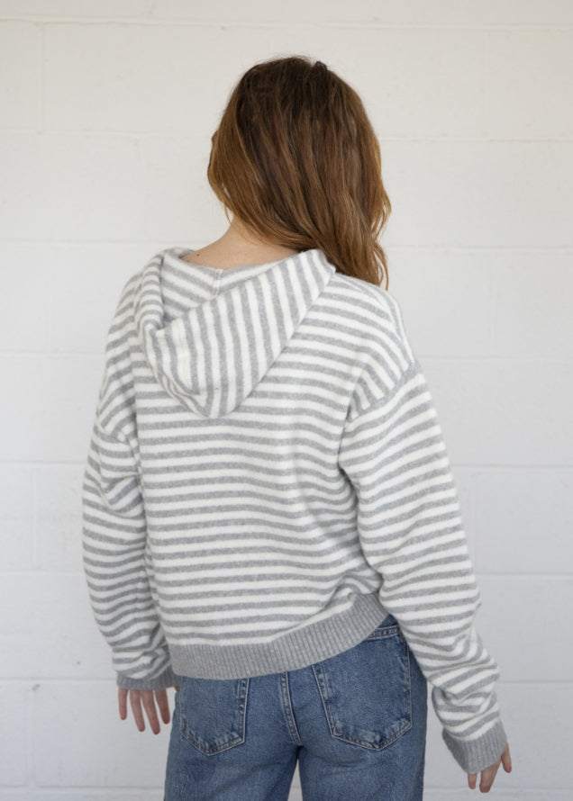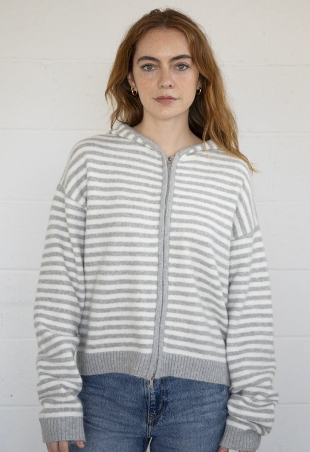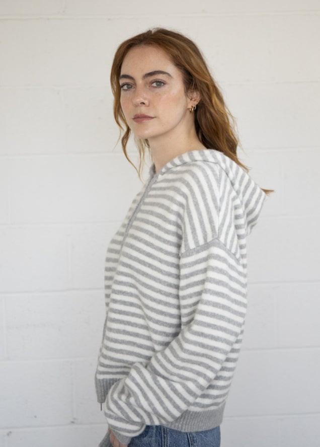The Wendy Striped Zip Up combines timeless style with practical versatility. This hooded sweater features classic stripes and a two-way zipper system, allowing you to customize your fit and ventilation throughout the day. The hood provides extra warmth and coverage, while the dual-zip design lets you wear it fully closed, partially open, or completely unzipped depending on your activity level and comfort. Perfect for layering or wearing solo, this piece transitions seamlessly from casual outings to active pursuits.