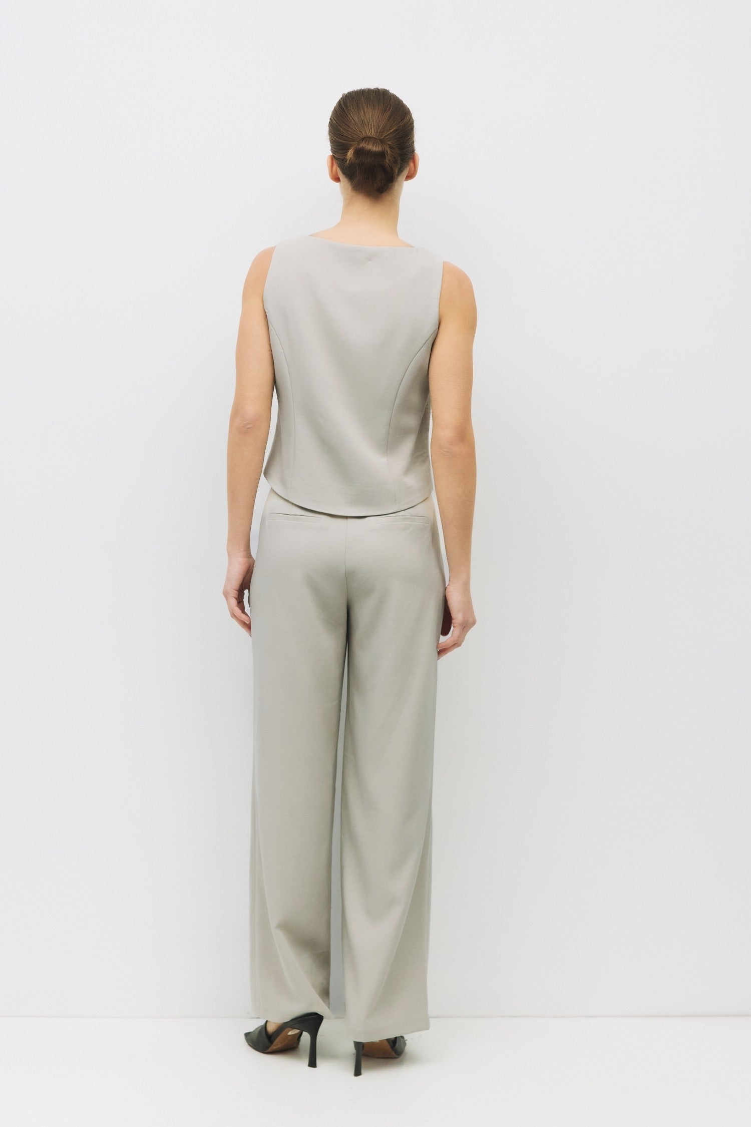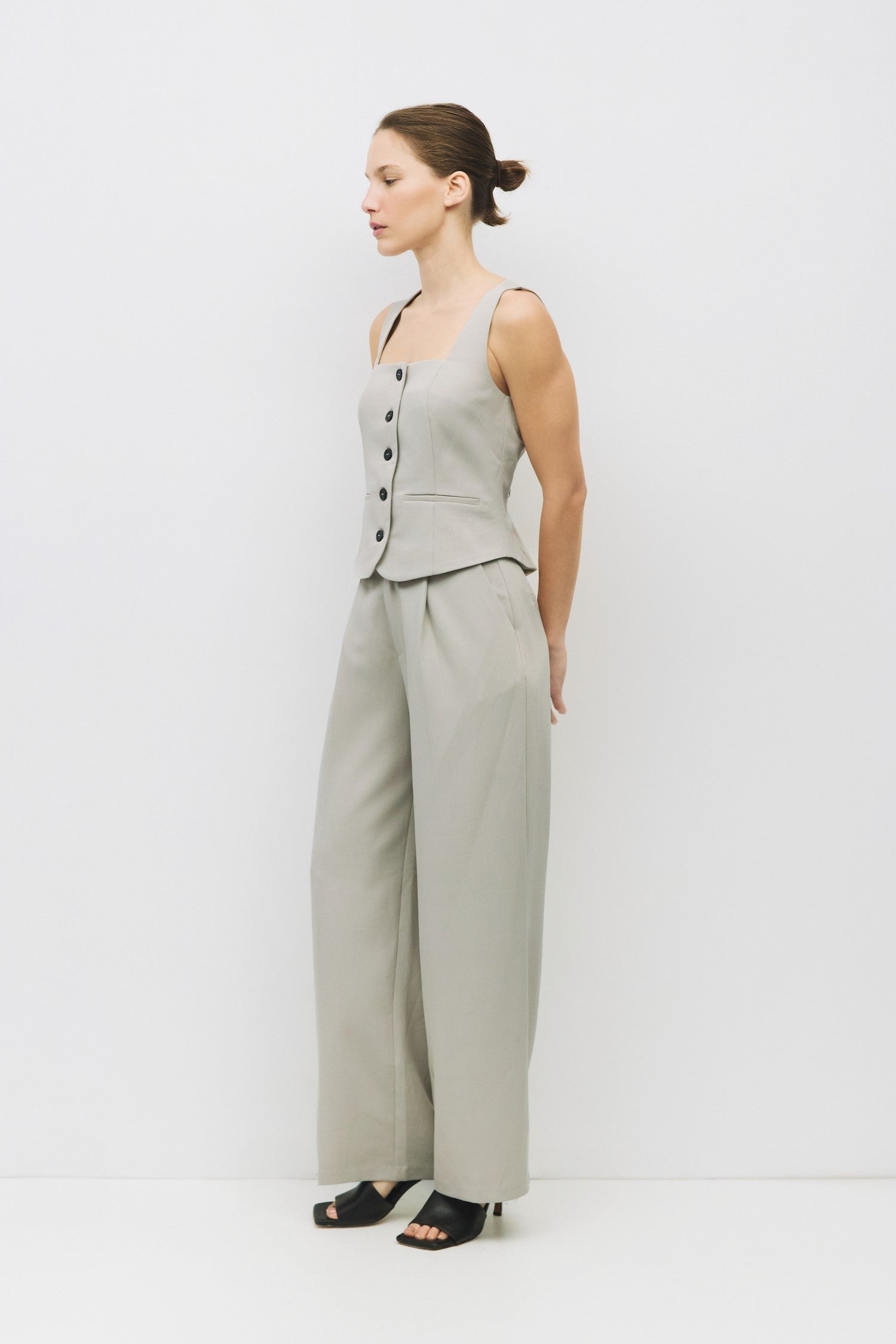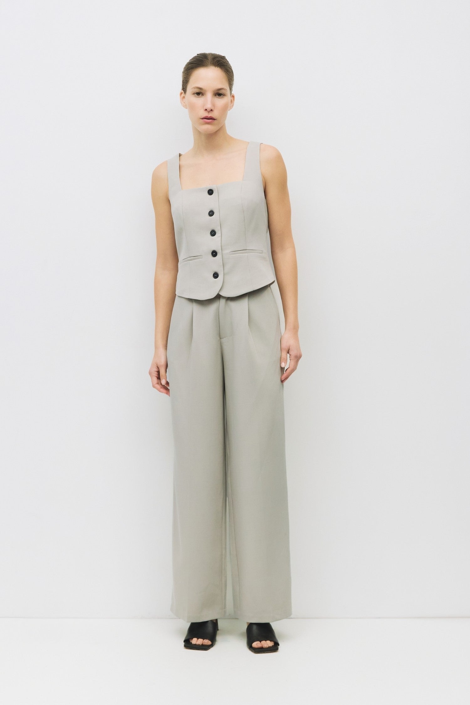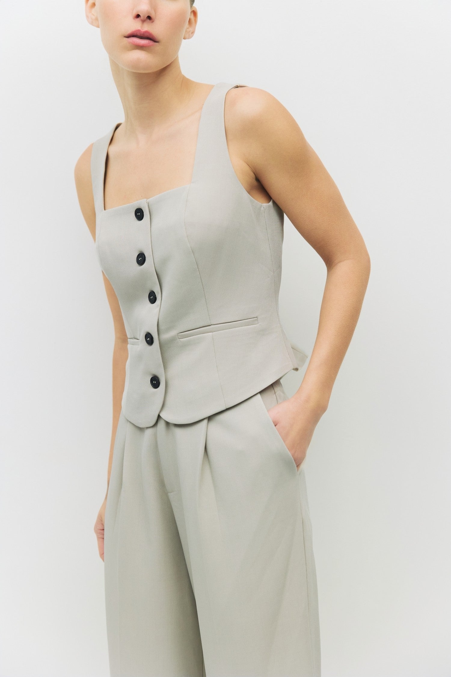 The Kiki Vest offers a refined sleeveless design with a square neckline and a tailored fit that enhances your silhouette. Its sleek front button closure adds a polished touch, while two front welt pockets provide subtle practicality without compromising style. Ideal for layering or wearing alone, this vest combines elegance with functional details for a versatile wardrobe staple.
