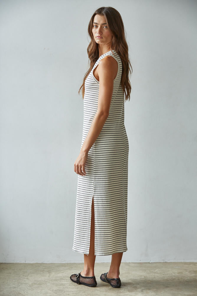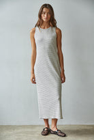 The Molly Ribbed Maxi combines comfort with contemporary elegance. Crafted from a knit cotton-spandex blend, this sleeveless round-neck dress features vertical ribbing that flatters the silhouette while providing gentle stretch for all-day wearability. The fitted pencil cut tapers gracefully to a maxi length, while a practical side slit enhances mobility. Vertical stripes add visual interest to this versatile piece. Unlined construction keeps the design lightweight and breathable, making it ideal for layering or wearing solo across seasons.